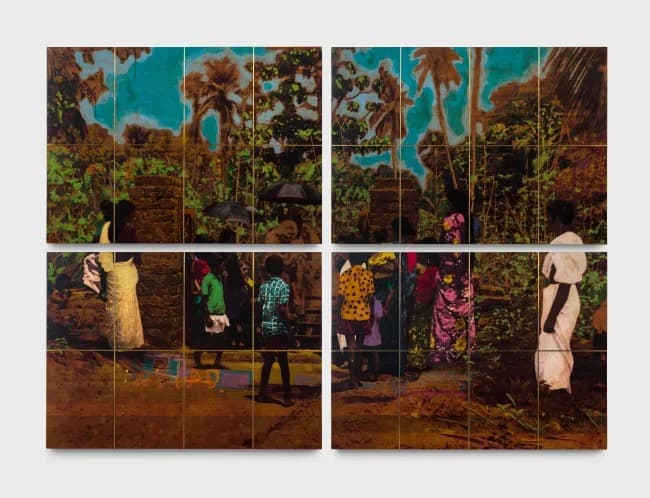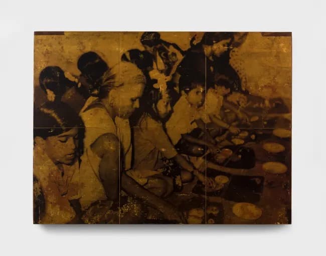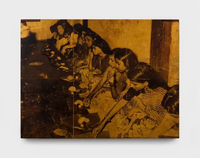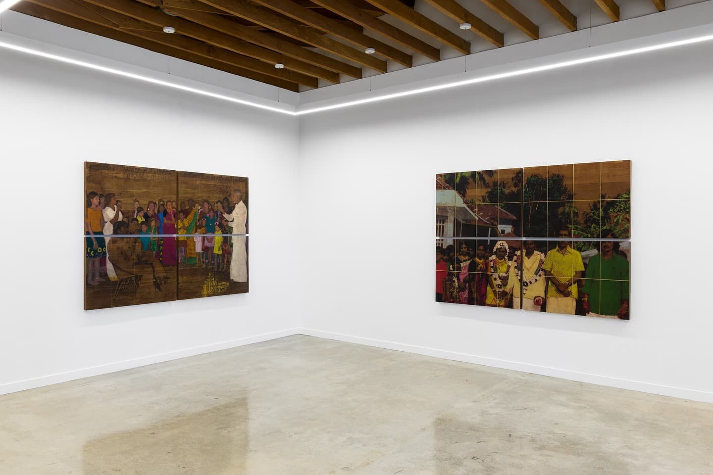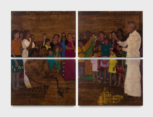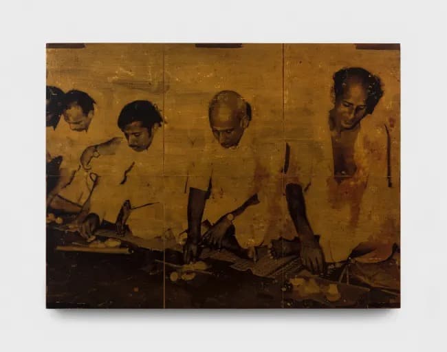 Rajiv Menon Contemporary presents 11th May 1980 Wedding Day, a solo exhibition by Mumbai-based artist Saju Kunhan. Using image transfer onto recycled teak and hand-painted color, Kunhan reanimates archival photos from a family wedding, exploring memory’s instability. The sequential panels evoke corridors of recollection, linking personal history to broader questions of migration, belonging, and displacement.