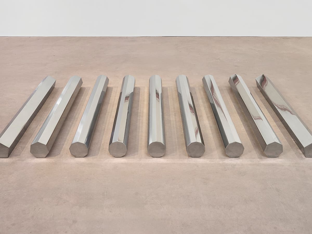 5, 7, 9, 11, 13 is a group exhibition with sculptures and drawings by Walter De Maria, Jasper Marsalis, Park McArthur, and Sung Tieu. The show’s title comes from the work by De Maria, which comprises nine stainless steel polygonal rods that are each either 5-, 7-, 9-, 11-, or 13-sided. Though their approaches differ, each artist’s work references systems of measurement and mechanisms of control, whether musical, mathematical, or spatial. Centering on themes of causality and performance, the selection of works allows for the reexamination of the personal and social structures that inform everyday experiences. All four artists have incorporated sound into their practice at some point. This connection is underscored with a sound piece program presented during the course of the exhibition.