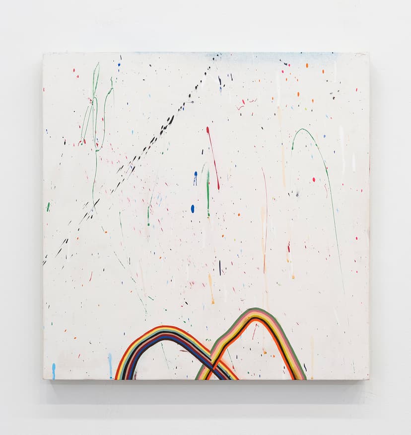 Alicia McCarthy’s work at Andrew Kreps Gallery features vivid, structured motifs—helices, rainbows, spectrums, and interwoven patterns—paired with spontaneous gestures. Rooted in her graffiti and punk background, the paintings balance precision with expressive mark-making. In works like Untitled, 2020, rhythmic forms meet splattered, cosmic fields, reflecting a process-focused practice shaped by material experimentation and the physicality of spray paint.