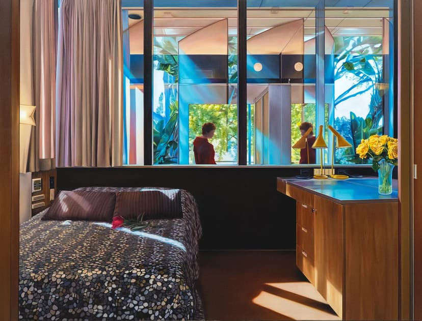 Alina Grasmannβs magical-realist paintings explore modernist architecture, blending the formal qualities of specific sites with their history. The light-filled lived environments become chamber-play stages for πππ»πππΈππΎπππ ππ ππππππ πΆππΉ πππΆπππΎπππΈπ, inviting viewers to step inside and become part of the scene.