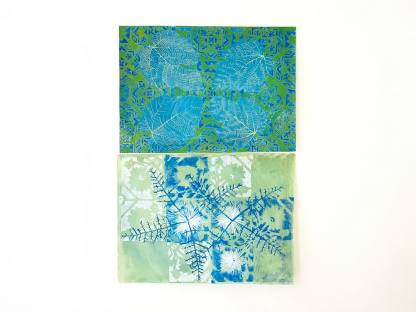 Wilding Cran Gallery is pleased to present Arrábida, a new series of works by Fran Siegel exploring the intersections of memory and place embedded within the botanical visual language of Portuguese azulejo tiles. Through cyanotype, drawing, collage, and shadow projection, Siegel constructs layered visual cartographies in which organic forms bleed into and disrupt geometric structures. The works examine how stylized vegetal forms both reflect and abstract local flora, serving as the foundation of classificatory systems, and carrying histories shaped by trade, religion, and cycles of destruction and renewal.