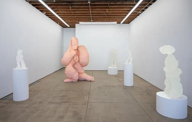 Wilding Cran Gallery presents Blobs and Bod, a sculptural series by Polly Borland that extends her long-standing investigation of the human body as a site of vulnerability and transformation. Using foam, nylon, and rubber bands to distort live models before scanning and casting them, Borland creates works that oscillate between playful and unsettling. At the center stands BOD, a towering aluminum figure surrounded by resin BLOB forms, together evoking metamorphosis, ambiguity, and the fluidity of identity.