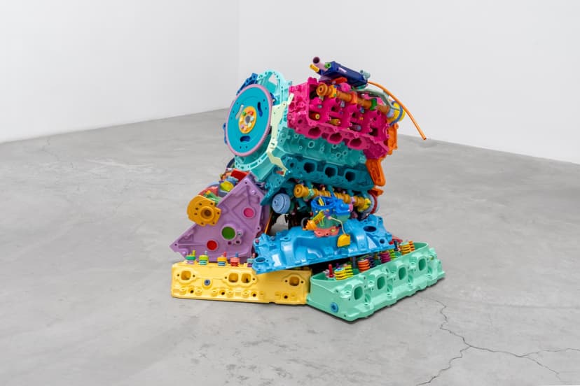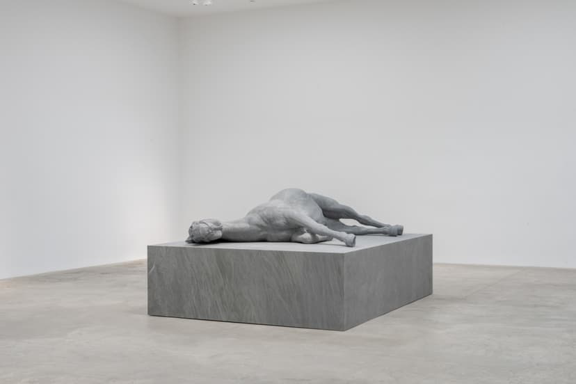 At Marks: Fallen Horse (2026), a life-size horse on granite ten years in the making, and The Animation of Pandora (2026), three over-life-size figures in painted white bronze. At Deitch: Firetruck (1993), a child's toy enlarged to life-size, and Pepto-Bismol in a Marble Box (1988), a white marble box filled with bright pink Pepto-Bismol.