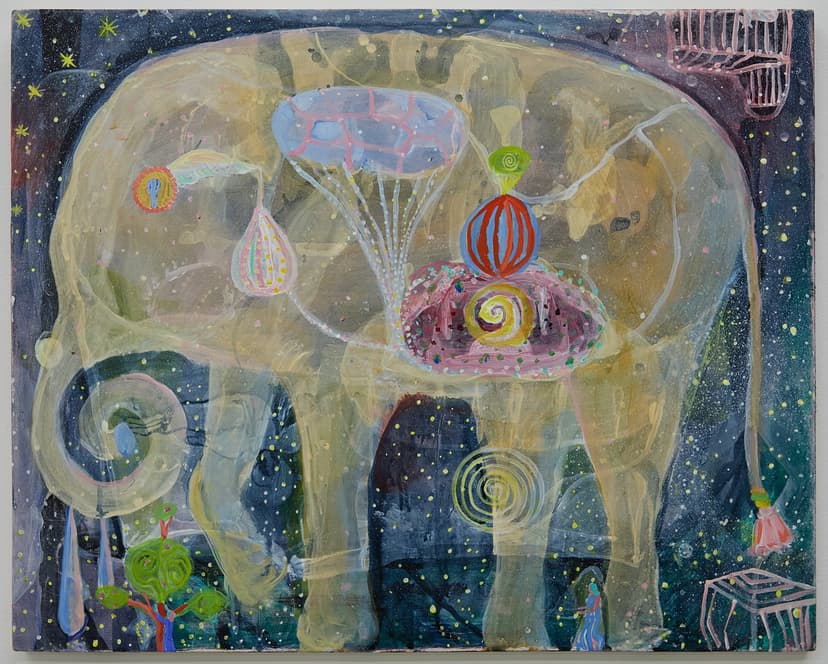 Lacey Black’s paintings are centered around a spiritual practice of going into the unknown, and searching for the unnamed connections within all living beings. Personal, fictitious and historical imagery are incorporated into works that are rooted in figuration, but explore lyricism, abstraction and surrealism. Black aims to create a pictorial language that rests just below the conscious surface. The paintings resist a singular interpretation, preferring to leave some questions unanswered, as they are in life. Black unites the organic with the artificial, bringing together independent shapes, beings, and objects, to create a whole. Images rest within images, elevating simplicity to a more profound meaning with added depth. The imagery in the exhibition presents an otherworldly connection between earth and the heavens while searching for new futures within ostensibly fixed systems.