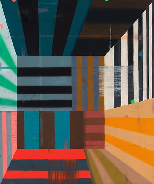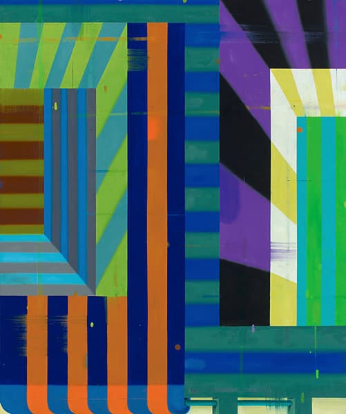 Deborah Zlotsky’s new paintings feature vibrant stripes within interlocking rectangles, where flatness and depth collide. Sharp turns, varied widths, and visual disruptions—blurred areas, odd angles, and trompe l’oeil strings—create a shifting, illusionistic space. Her work layers history and technique, evoking both timeless aesthetics and cultural symbolism, while marks of wear and accumulation reflect the passage of time and the interplay of past and present.