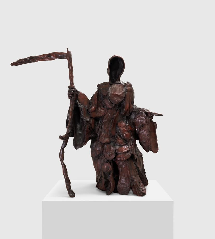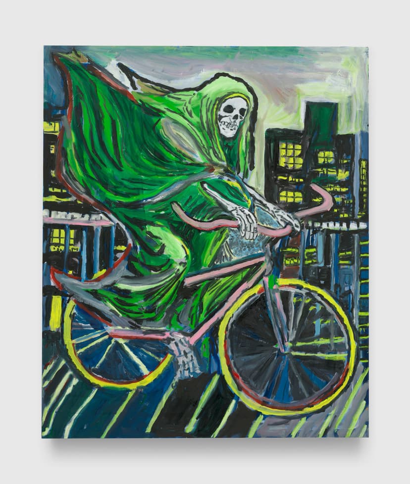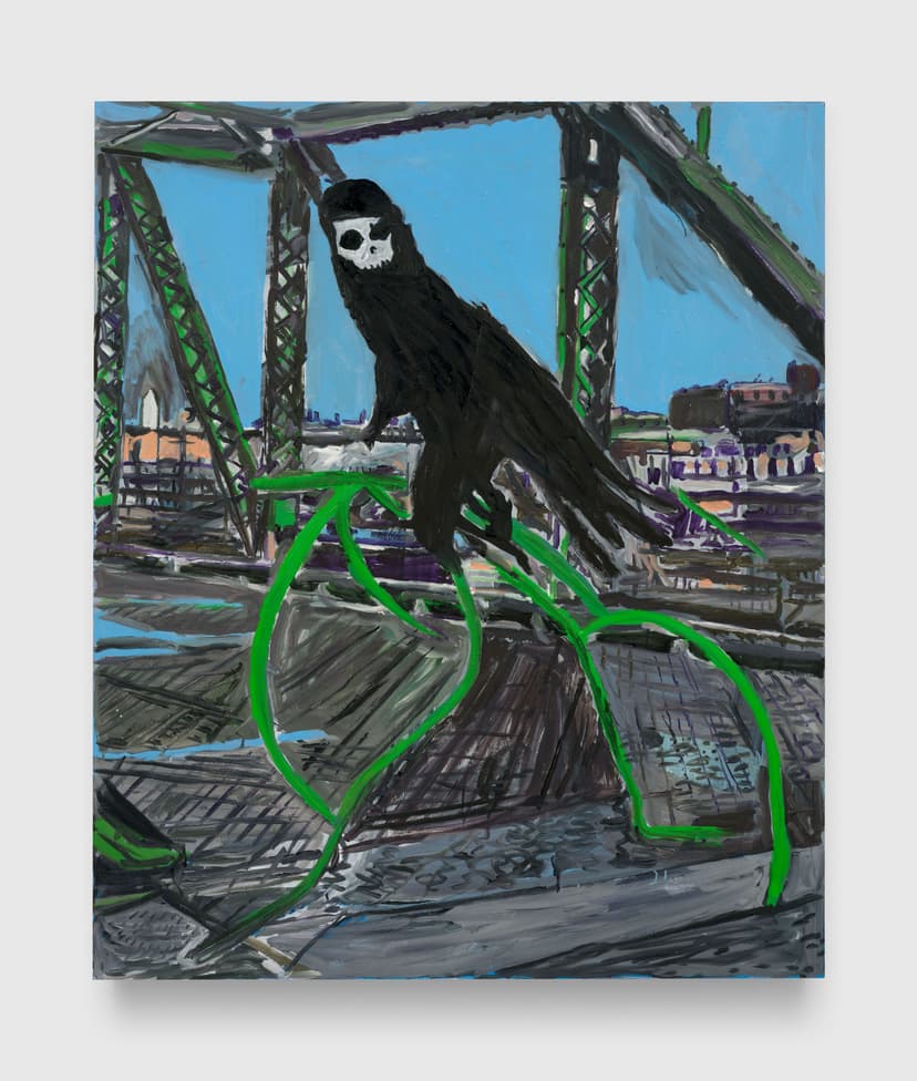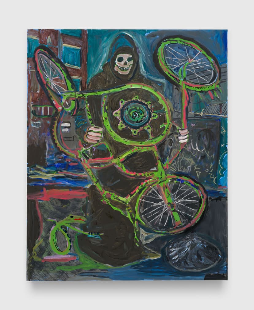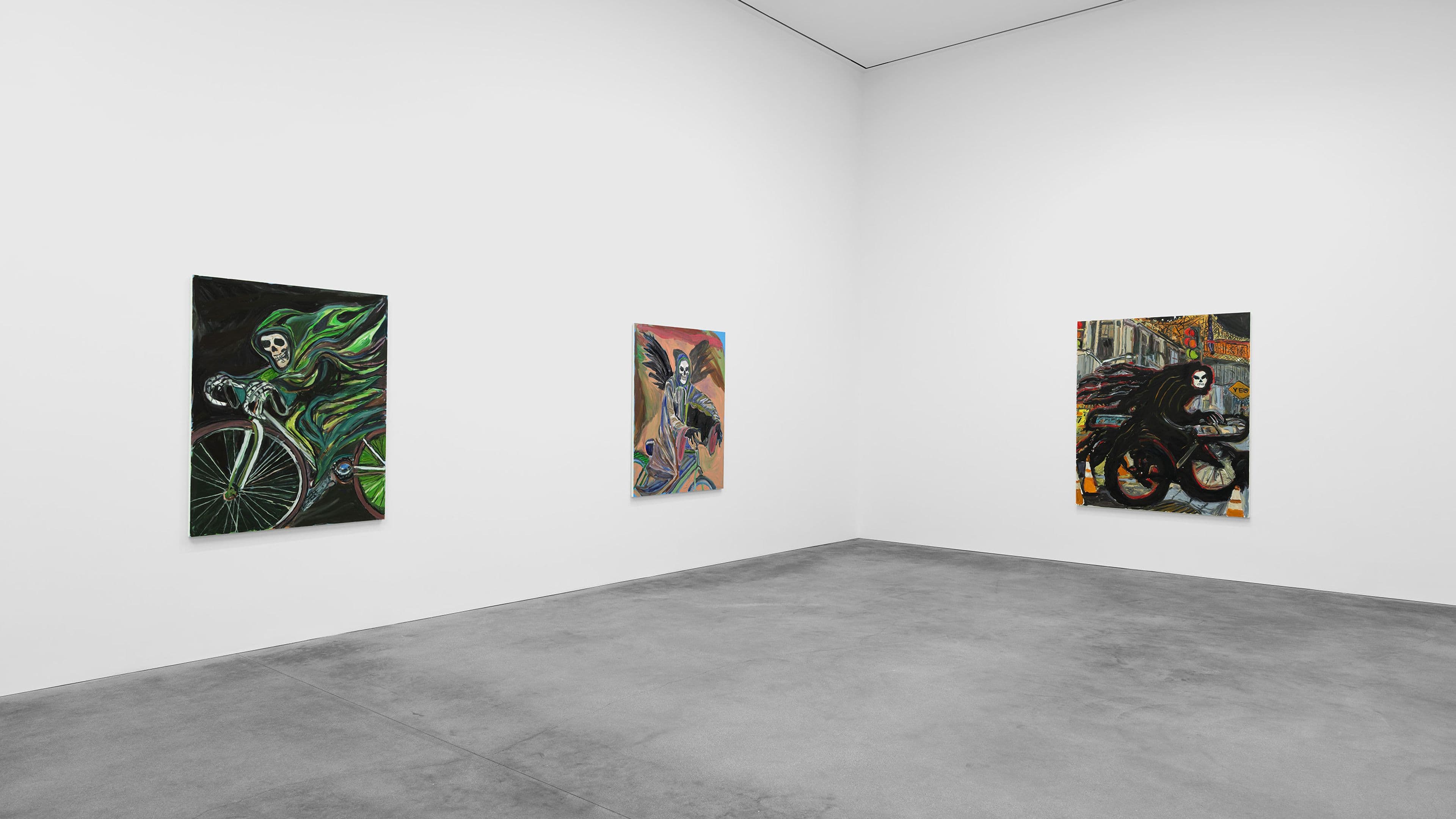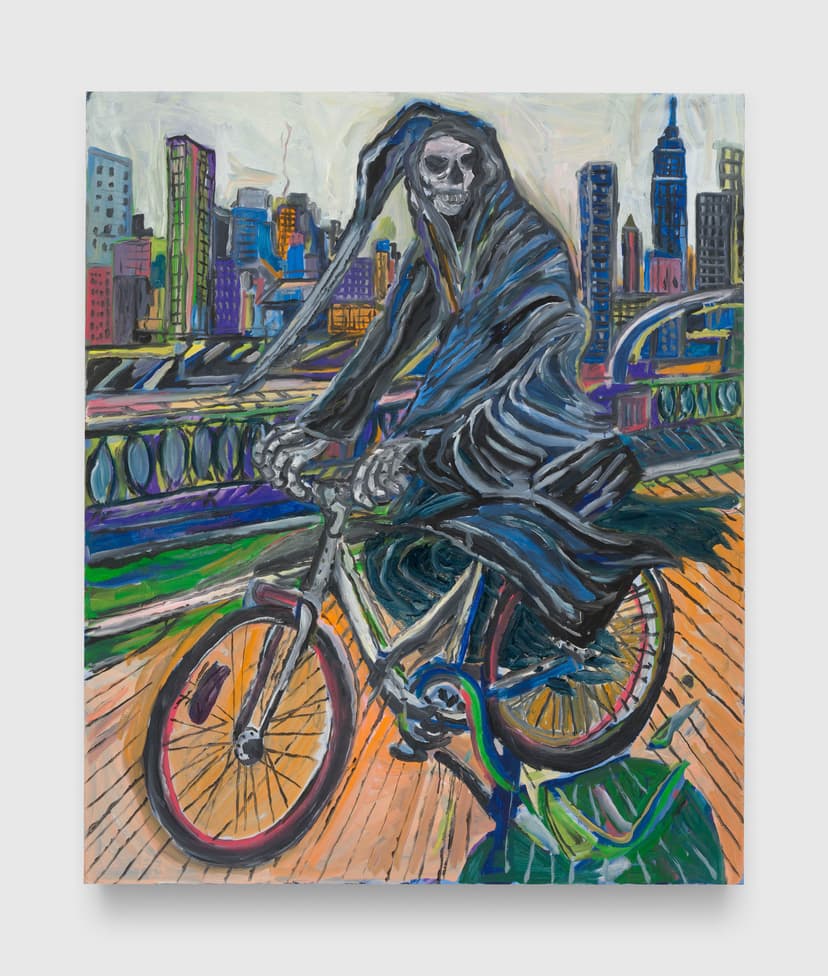 For Destiny, Smith has made a series of paintings that continue his long-running dialogue with the grim reaper, a figure that has appeared in his work for years in countless guises. In these new canvases, the reaper is set loose in New York City, riding a bicycle through familiar streets, cutting past landmarks like the Empire State Building and the Statue of Liberty. The once faceless symbol of death now has eyes and stares back at you, tangled in the swirl of the city. It is funny, unsettling, and alive. For Destiny, Smith has made a series of paintings that continue his long-running dialogue with the grim reaper, a figure that has appeared in his work for years in countless guises. In these new canvases, the reaper is set loose in New York City, riding a bicycle through familiar streets, cutting past landmarks like the Empire State Building and the Statue of Liberty. The once faceless symbol of death now has eyes and stares back at you, tangled in the swirl of the city. It is funny, unsettling, and alive.
