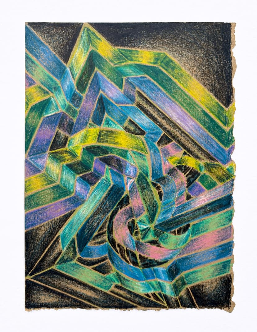 Nicholas Moenich’s drawings combine figuration and abstraction to form psychologically charged spaces shaped by layered references, from medieval manuscripts to comics and music. Emphasizing framing and compressed pictorial fields, the works intertwine text like forms and rhythmic structures. These compositions reflect the tension of making and the experience of time within densely mediated visual environments.