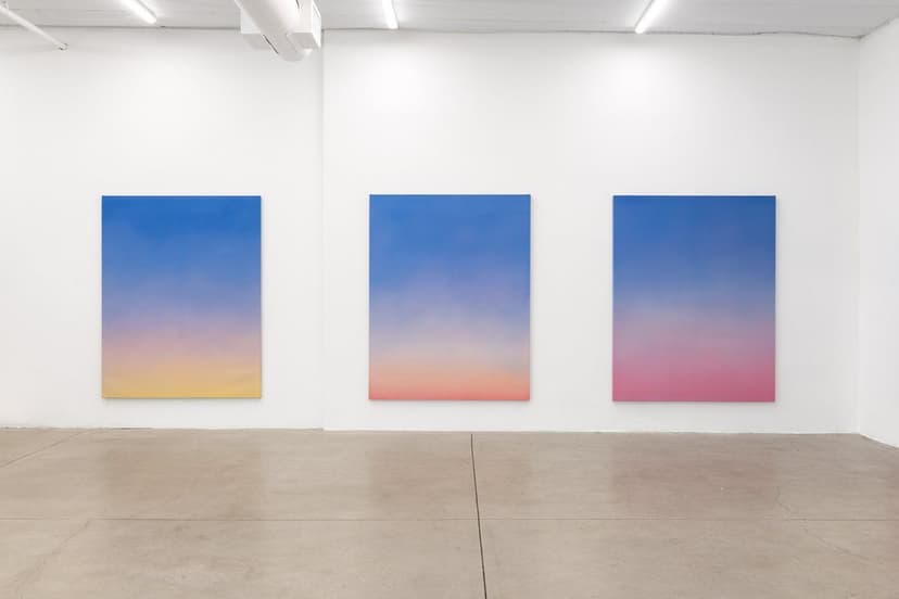 Rebecca Partridge’s exhibition Dusk, Dawn, Day in Los Angeles presents her ongoing Sky Paintings, large-scale abstractions of the sky painted from memory rather than direct observation. Layering translucent watercolors, she captures the shifting light of dawn, dusk, and daylight as experienced rather than seen. These works reflect the intersection of perception, memory, and physical process, transforming personal impressions of the sky into evocative, universal expressions of lived experience.