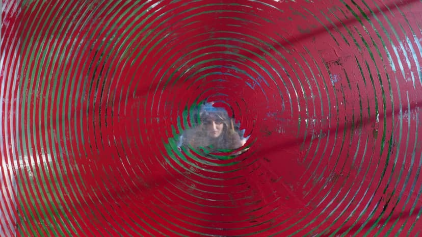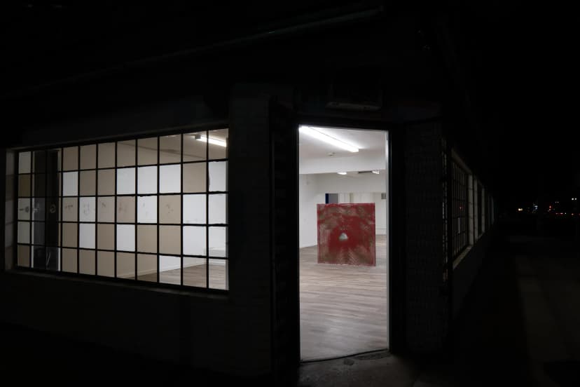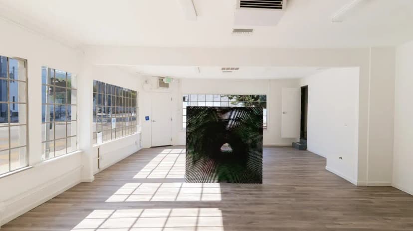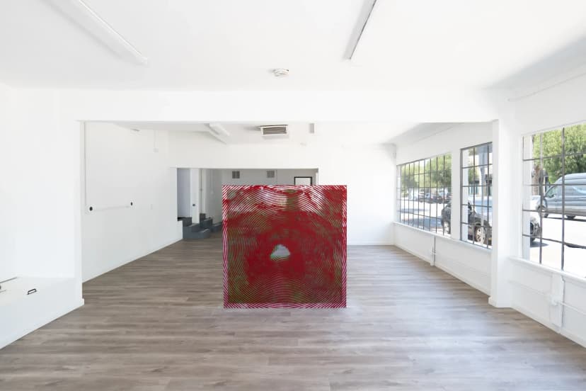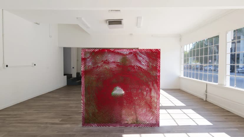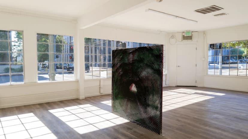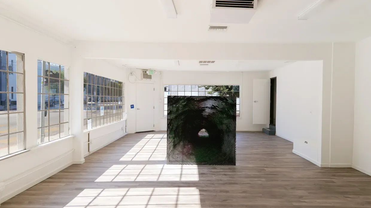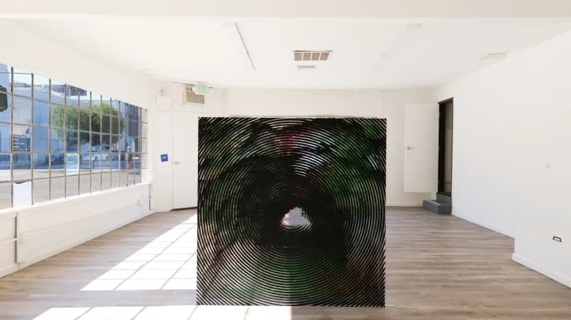 Giovanni’s Room presents EEGAH, Jake Freilich’s first exhibition with the gallery, featuring a single large-scale painting from his moiré series. Using repeated halftone images of the Bronson Caves in black, green, and red, Freilich creates a person-sized moiré effect activated by viewer movement and intensified through photography. Based in Los Angeles, Freilich’s practice investigates the history of painting and its potential for visual motion.
