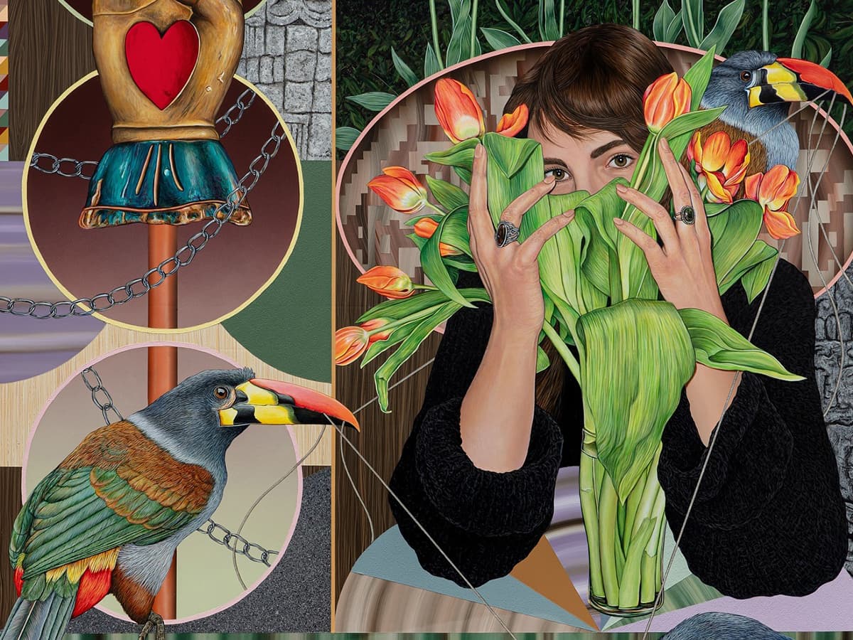 Harper's presents Escaping the Aviary, Christian Ruiz Berman's first solo show with the gallery. His paintings build compositional systems rather than scenes — plants, animals, figures, and decorative objects moving through geometrically structured, Escher-like spaces drawn from histories of migration, Mexican visual culture, and magical realism. The exhibition invokes Sophia, the Gnostic figure of wisdom, as a quiet framework: transformation emerging from within rather than imposed from outside. Boundaries stay provisional, meaning stays fluid, and liberation arrives through reordering rather than rupture.