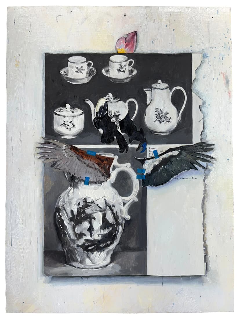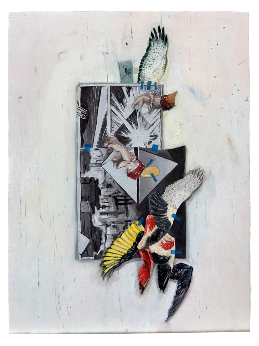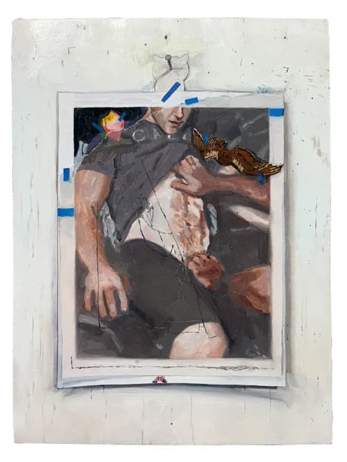 Flight Spiral features paintings by Hank Ehrenfried based on studio collages assembled from auction catalogs, online images, erotica, and printed matter. The collages are affixed to the wall and rendered in trompe l’oeil, with shifts in focus and surface detail emphasizing their provisional state. Recurrent images of wings invoke ephemerality, history, and the instability between source material and representation.