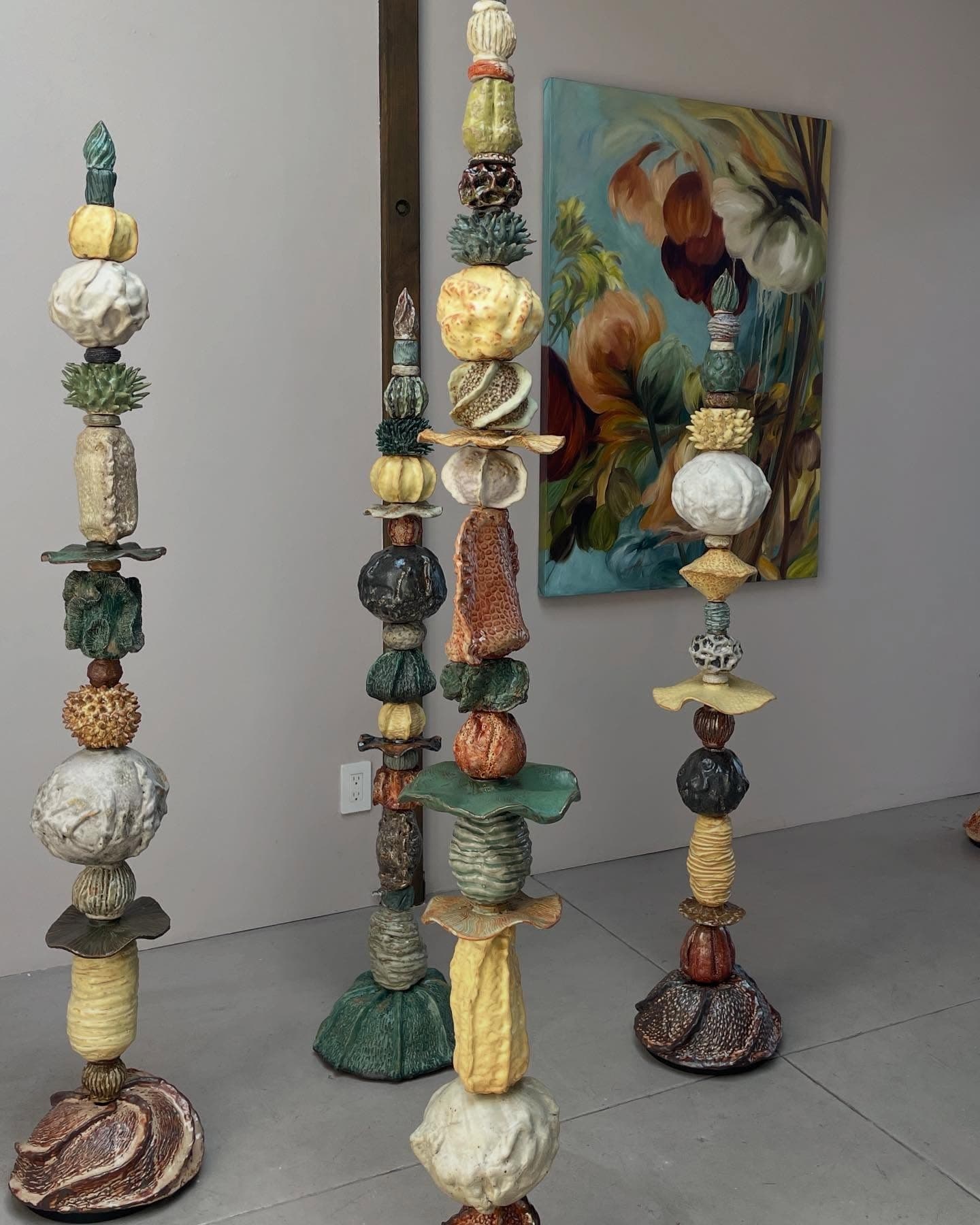CULT Aimee Friberg presents flora and form, featuring oil paintings by Anna Sidana and ceramic spires by Adrian Pally. Sidana’s vivid works draw from childhood memories in India, using cotton blooms to explore personal and cultural histories. Pally’s hand-built ceramic spires evoke organic growth, drawing inspiration from nature and decades of ceramic practice. Together, their work investigates how form, memory, and emotion intertwine through color, material, and process.