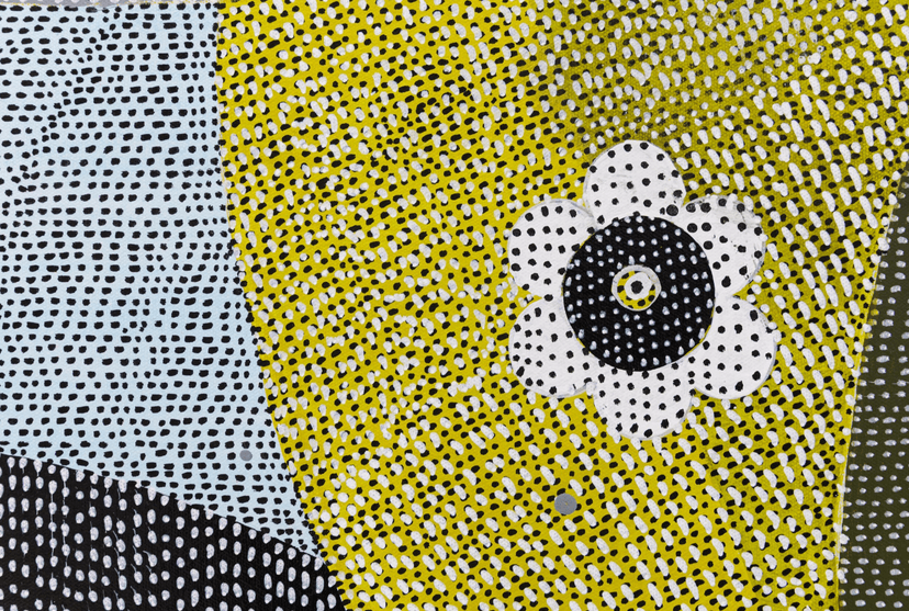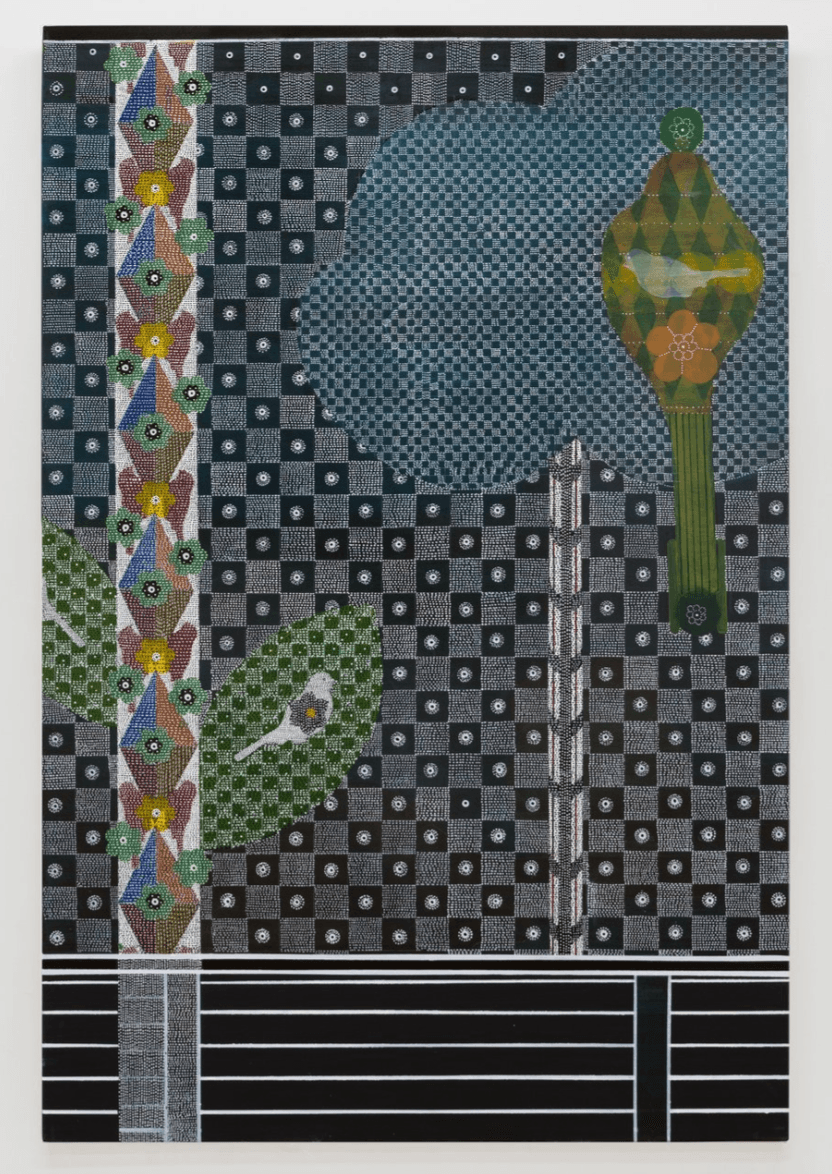 Chris Sharp Gallery is pleased to present a solo exhibition of paintings by the New York-based artist, Glenn Goldberg. A unique, idiosyncratic figure among the landscape of contemporary painting, 71-year-old, Bronx-native Glenn Goldberg’s work is delightfully difficult to categorize, and for this reason alone, stands out and refreshes the discussion around the world’s oldest medium. “There are no birds in my work,” says Goldberg of his most recent body of paintings, whose primary motif just happens to be the silhouette of a bird. Never mind that the avian cutout essentially functions as a structural device, the beauty and felicitous, koan-like logic of this statement starts to make perfect sense when you consider everything else that’s going on in his paintings. Meticulously crafted via a systematic mark-making method which resembles stitching on top of demarcated fields of vibrant color, the paintings are liable to bring to mind everything from Persian rugs to Tibetan mandalas to aboriginal picture making to the flat, spaceless graphics of early video games. Their compositions and colors seem to be galvanized by a crystalline, pictorial logic that appeals directly to an intuitive understanding that exists right on the threshold of language. Any attempt to explain them, like a dream, all but makes them flutter and flee; quietly observed and admired, they glow and shimmer like incontrovertible facts which casually defy the laws of gravity, not to mention picture-making.
