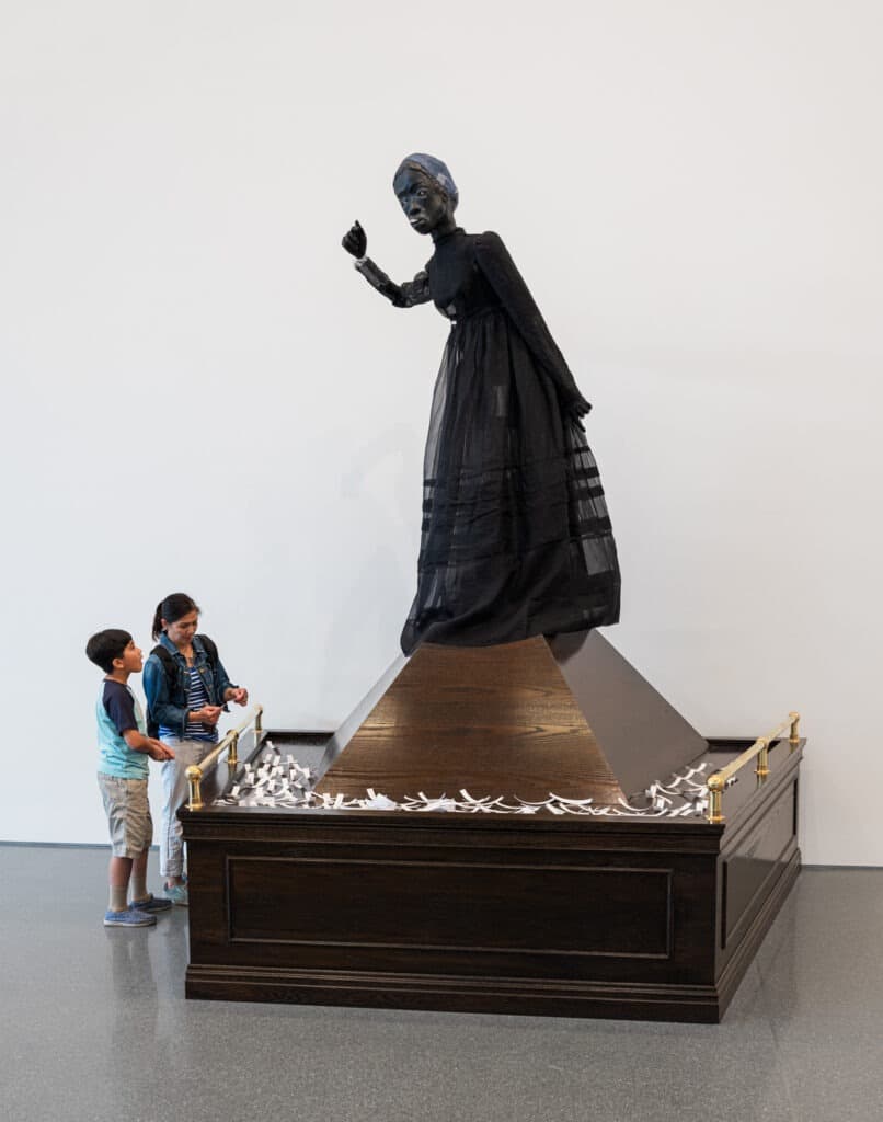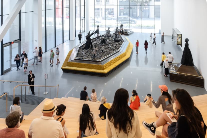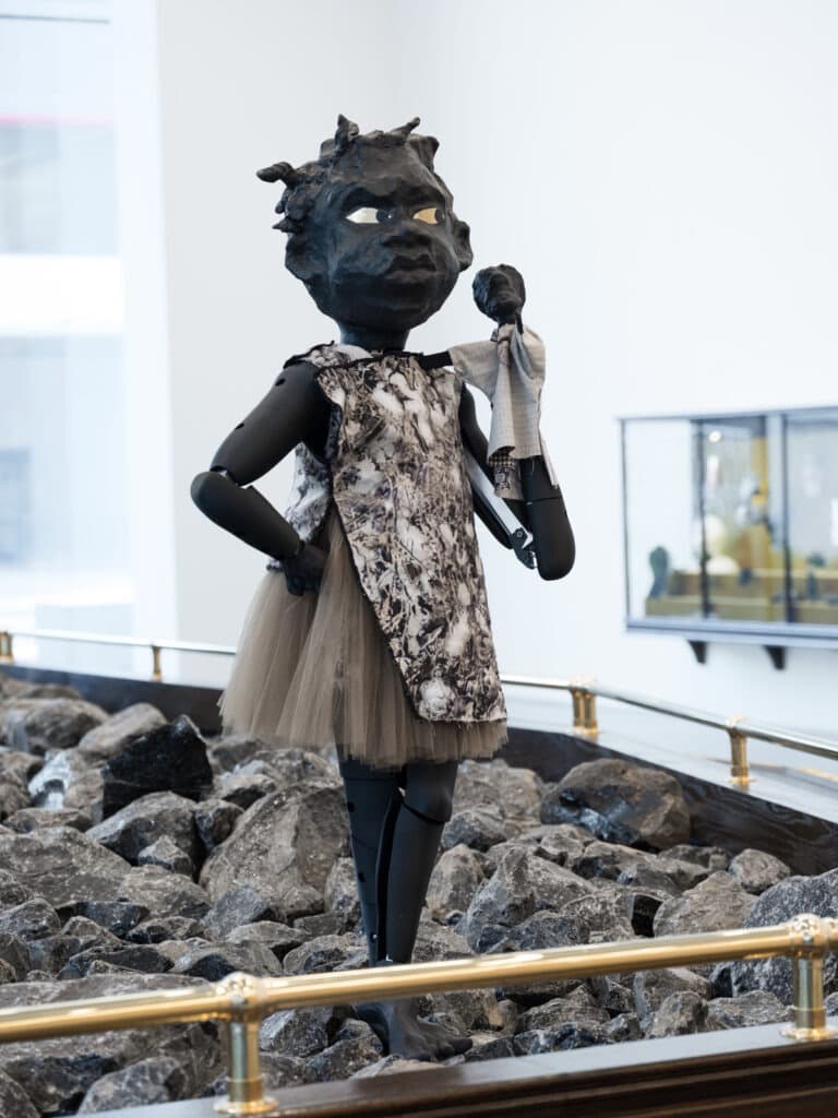 Kara Walker’s Fortuna and the Immortality Garden (Machine) examines power, trauma, and transformation through automatons engaged in perpetual ritual and struggle. Inspired by sources ranging from antique dolls to Octavia Butler’s Parable of the Sower, the installation features figures set within black obsidian, evoking spirituality and renewal. At its center, Fortuna interacts with visitors, offering printed fortunes as gestures of reflection, absolution, and hope.