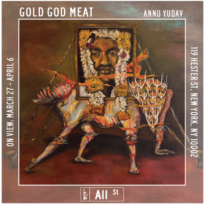 All Street Gallery presents Gold God Meat, a solo exhibition by Annu Yadav, curated by Bebe Uddin. Through paintings, sculptures, and sketches, Yadav explores the tension between reality and illusion, using the female body as a site of power, transformation, and divinity. Her work fuses myth, ritual, and corporeal existence, depicting womanhood as both sacred and contested. Drawing from Indian vernacular aesthetics, she envisions a space where past and future merge in raw, visceral narratives.