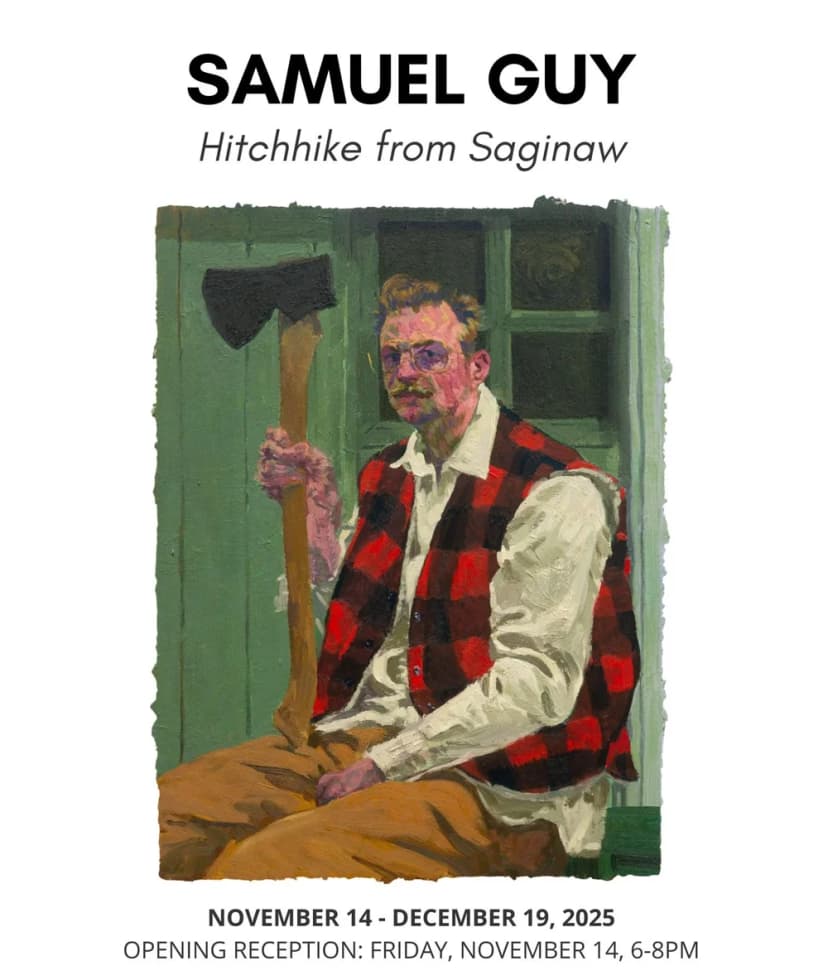 Auxier Kline presents “Hitchhike from Saginaw,” Samuel Guy’s second solo exhibition. Inspired by American road movies, Guy portrays mythic American men through self-portraits, adopting historic portrait conventions while exploring identity, performance, and cultural archetypes. Each work balances tenderness, irony, and introspection, examining the fragments of Americanness and the roles we inhabit, with Guy embodying hero, parody, and everyman.