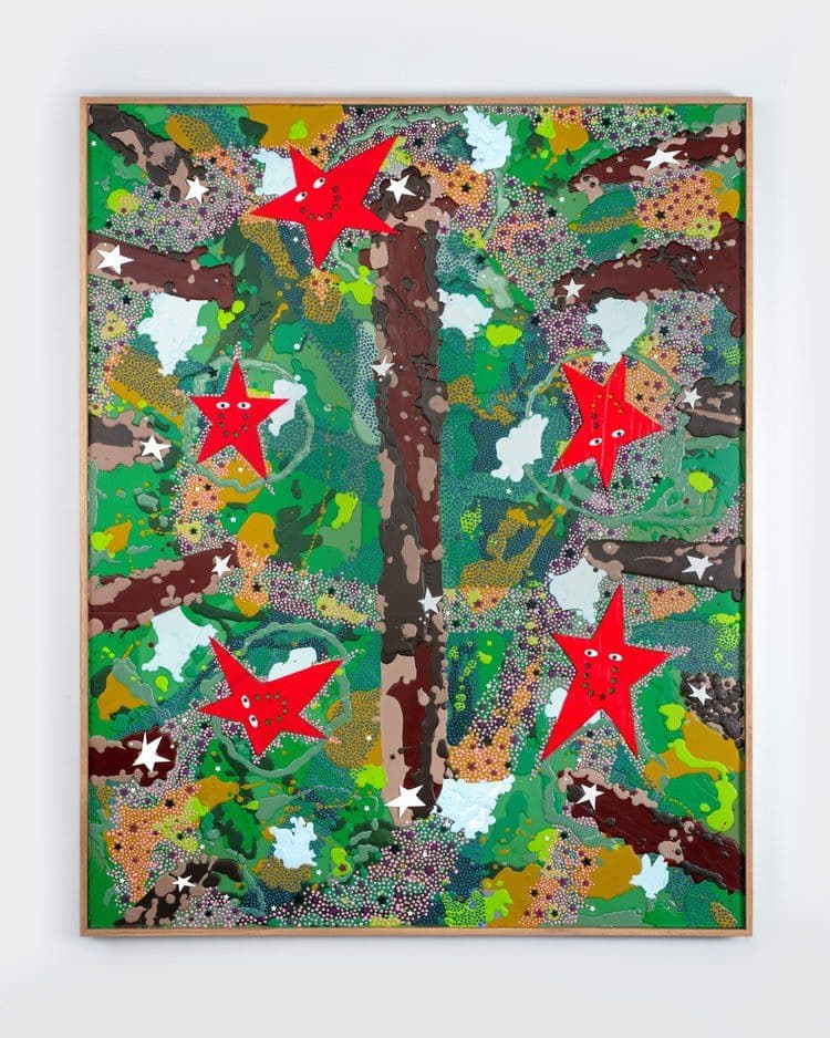 A Hug From The Art World presents HOLLOW, Bryan Jabs’ second exhibition with the gallery, featuring his first exploration into painting. Using wax applied with everyday tools, Jabs creates textured, colorful surfaces built from poured, dripped, and collaged wax. Abstract fields dotted with star shapes hint at familiar imagery, with smiling stars evoking a playful, alien world. The work reflects Jabs' pursuit of transformation, self-discovery, and shared joy through material experimentation.