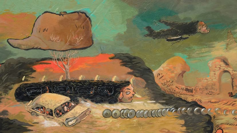 Ali Eyal: Imagine, this happened just an hour ago traces how memory, loss, and violence linger after war. Drawing on vanished spaces from his Baghdad childhood, Eyal creates oil paintings, drawings, and assemblages that distort time and perspective. Vivid, cartoonlike scenes merge recollection with invention, revealing trauma as an ongoing process shaped by imagination, exile, and repeated acts of remembering.