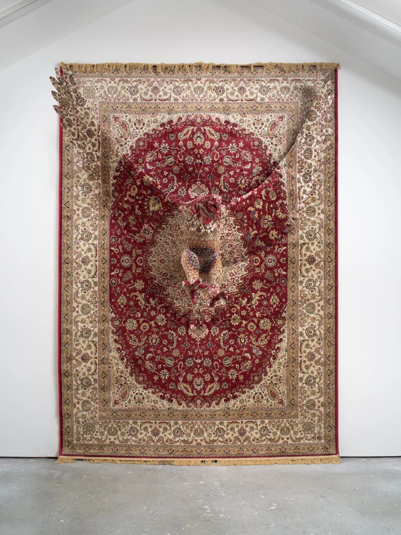 Debbie Lawson: In a Cowslip's Bell I Lie presents life-sized animal sculptures — bears, cougars, wild dogs, monkeys — that emerge from Persian carpets through trompe-l'oeil effects, patterns meticulously aligned to create seamless continuous surfaces. Taking its title from Shakespeare's The Tempest, the exhibition imagines creatures breaking free from the decorative forms that have long subsumed them — from heraldic carvings to William Morris designs. For Lawson, these animals are also avatars of women historically confined to the domestic and the decorative, their considerable creative talents trapped within the daily grind.