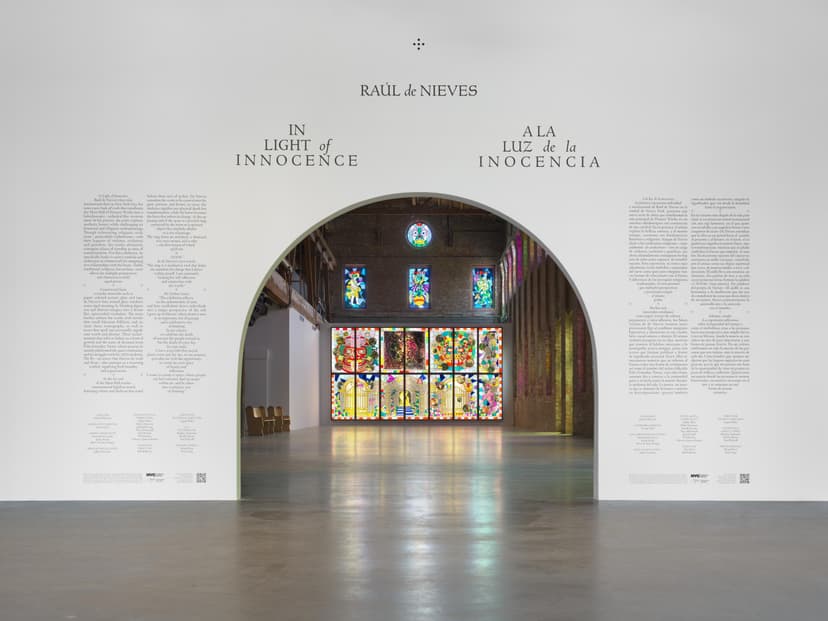 In Light of Innocence marks Raúl de Nieves’s first solo institutional exhibition in NYC, transforming Pioneer Works’ Main Hall into a radiant, cathedral-like space. Using everyday materials like acetate and tape, de Nieves creates 50 faux stained-glass panels and a lightbox mural inspired by Catholicism, tarot, and Mexican folklore. His immersive installation invites reflection on transformation, light, and the poetic possibilities found in both language and material.