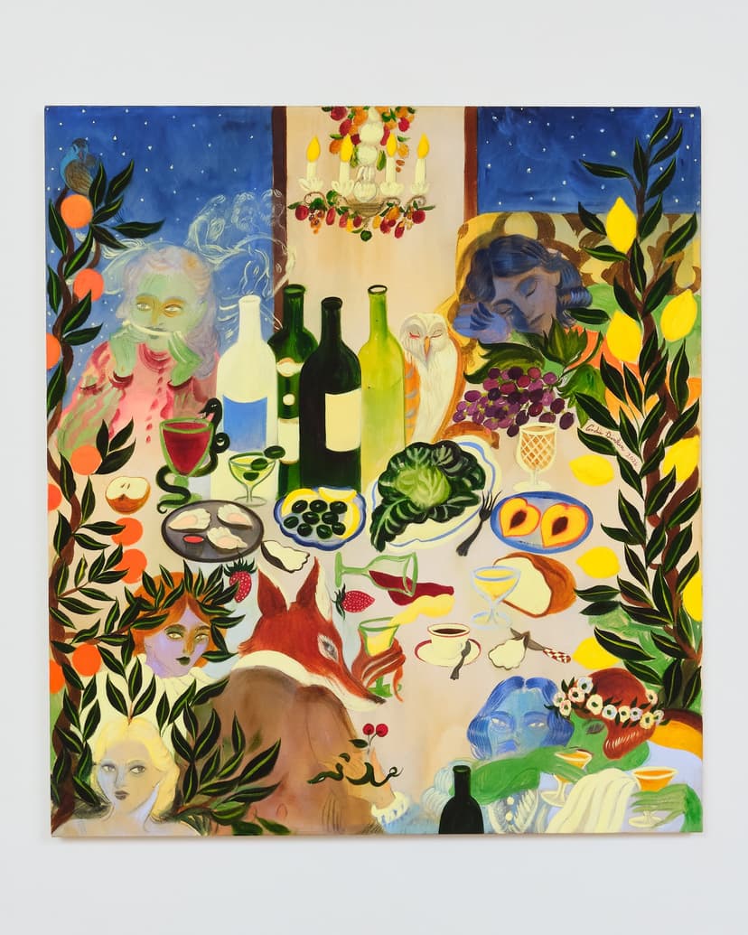 Charles Moffett is pleased to present "In the Spirit World," Los Angeles-based artist Andie Dinkin’s first solo exhibition with the gallery. The show gathers together Dinkin’s work across media, including the acrylic and gouache paintings on canvas and paper for which she is best known, largescale drawings, as well as a collection of painted ceramics; a first foray into medium for the artist, created in collaboration with her ceramicist sister. Drawing inspiration from a vast and deep well of influences, encompassing fairy tales, mythology, dream imagery, films, personal memories, and the work of artists spanning centuries, Dinkin creates theatrical compositions in vibrant color that blend the surreal and fantastical with the earthly and the human, rendered through notes of sorrow, joy, humor, and longing.