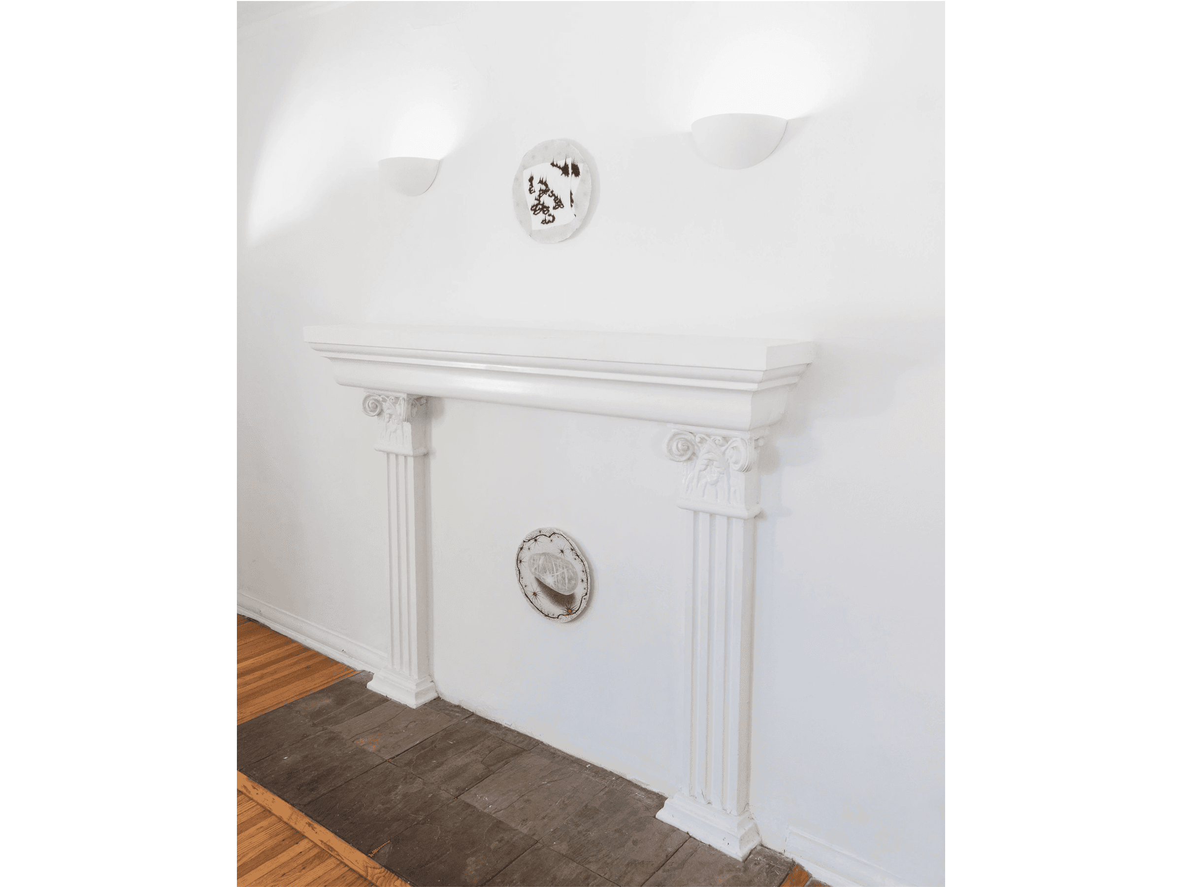 Her unframed tondos—ranging from 12 to 50 inches—depict objects like a mortar and pestle (Preserves, 2024), a wishbone (The Bigger Piece, 2024), coupe glasses, and bouquet wrappers. These items link memory to form. Lerner sketches and photographs them before rendering each in dense black and pale gray on white grounds.