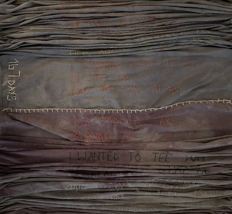 ’ve Got To Tell You Something Now by Antunes is a portrait of resistance and memory, comprising a film, object, and artist book. Over 365 days, Antunes hiked a mountain during the Covid-19 lockdown, stitching daily reflections onto fabric. The resulting 90-foot scroll and video document this physical and emotional journey. The work invites viewers into a contemplative space where movement, stillness, and memory intersect through repetition, grief, and eventual acceptance.
