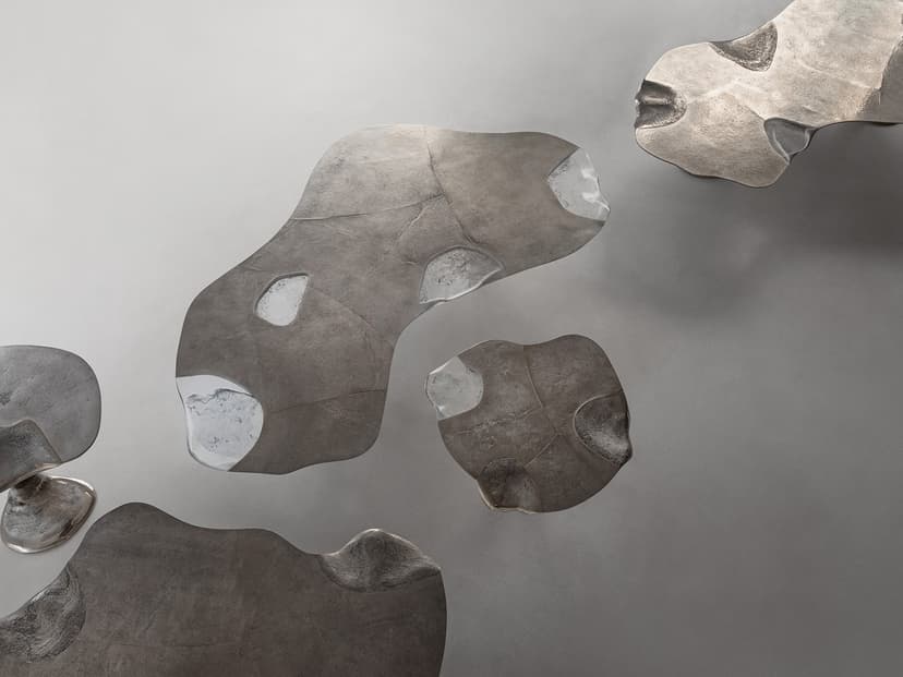 Je Marchais Pieds Nus Dans L’Étang (meaning ‘I Walked Barefoot in the Pond’) reinterprets the pond as a sculptural environment, where organic forms, shifting reflections and enigmatic creatures emerge within a dynamic spatial composition. A collection of individual unique works of art come together as a singular cohesive installation, where each sculptural element contributes to a fluid, immersive experience, evoking the sensation of wading barefoot through an imagined landscape.