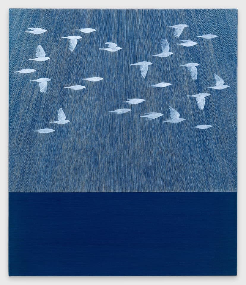 P·P·O·W presents Night Birds, Karen Arm’s seventh solo exhibition with the gallery. Spanning six years of work, the show reflects Arm’s ongoing inquiry into the natural world through intricate compositions of waves, rays, and light. Using layering and glazing, her paintings evoke unseen forces and celestial rhythms. Drawing on how birds navigate by planetary cues, Arm connects elemental forms—light, ocean, flight—into a visual experience that feels both cosmic and deeply grounded.