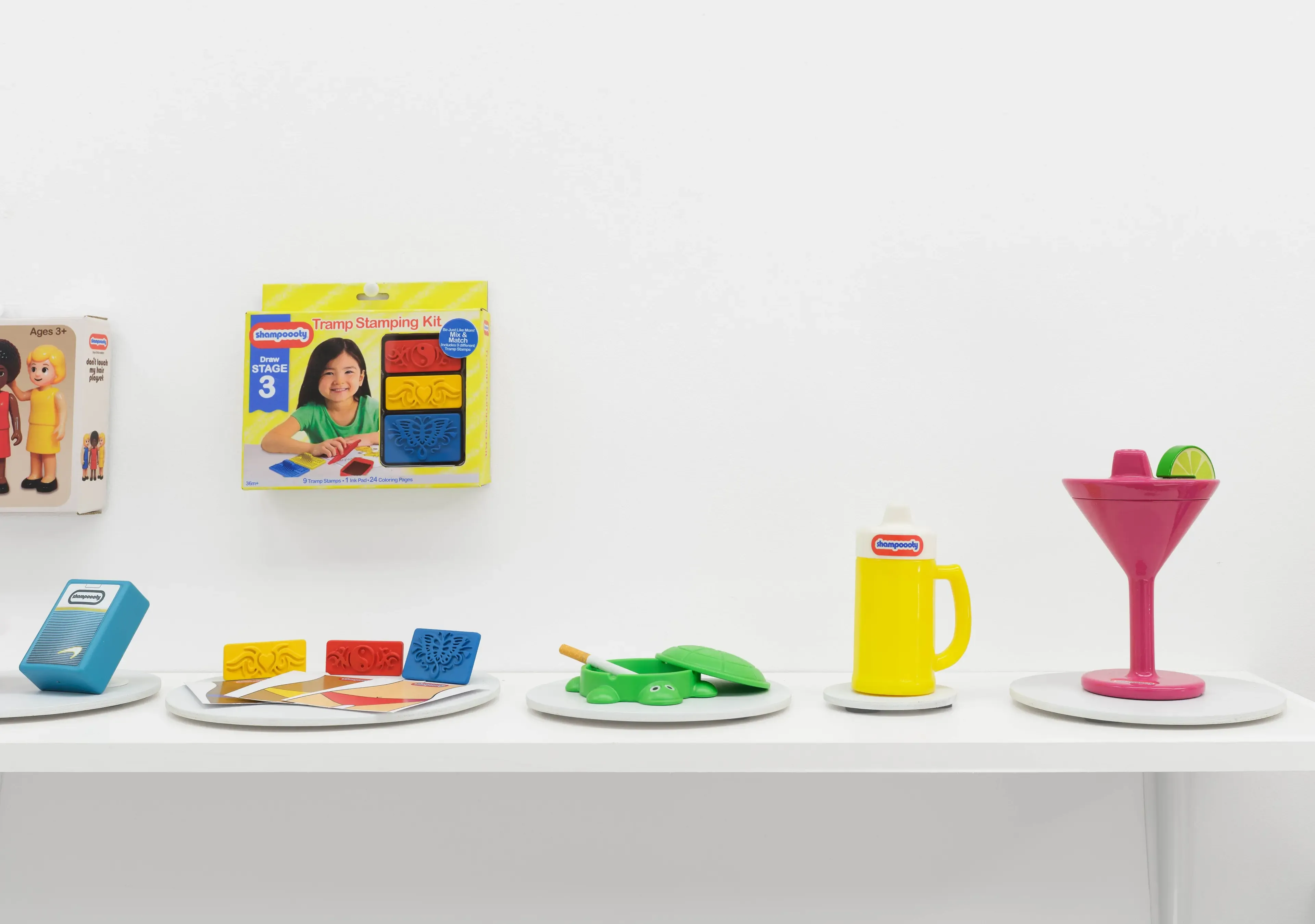 Shampoooty presents sculptural works that recast childhood toys through adult experience. Developed from a daily 3D modeling practice, the pieces echo commercial packaging while addressing grief, addiction, mortality, sexuality, anxiety, and violence. Familiar forms gain emotional weight as surface charm meets psychological depth.