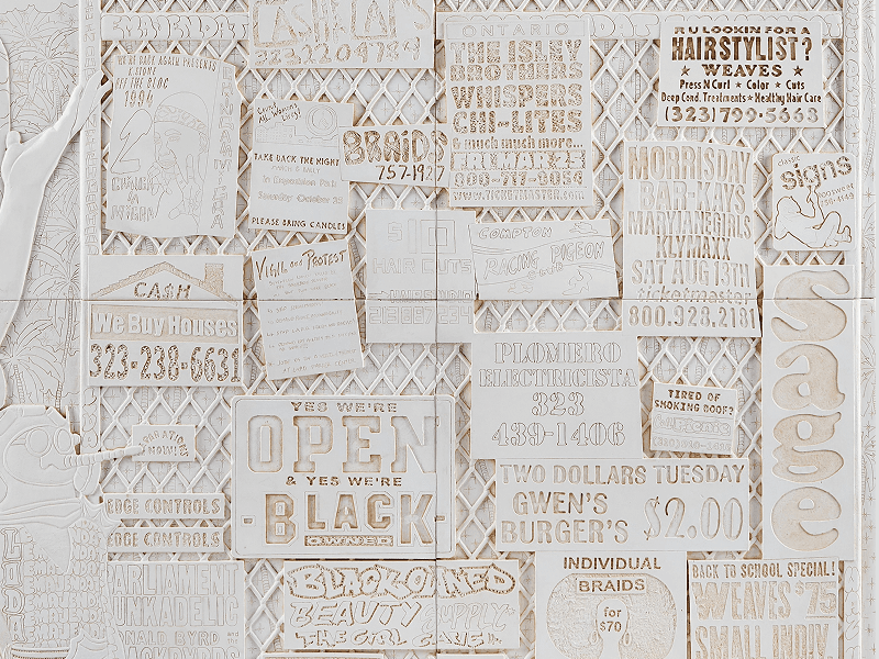 Gagosian presents new works by Lauren Halsey at its Park & 75 location. The installation features protruded engravings and a large-scale plaza sign sculpture inspired by the visual culture of South Central Los Angeles. Halsey reimagines community signage and local iconography as monuments to Black life, merging personal memory, urban design, and diasporic mythology.