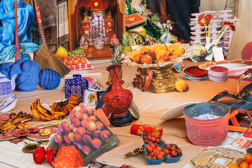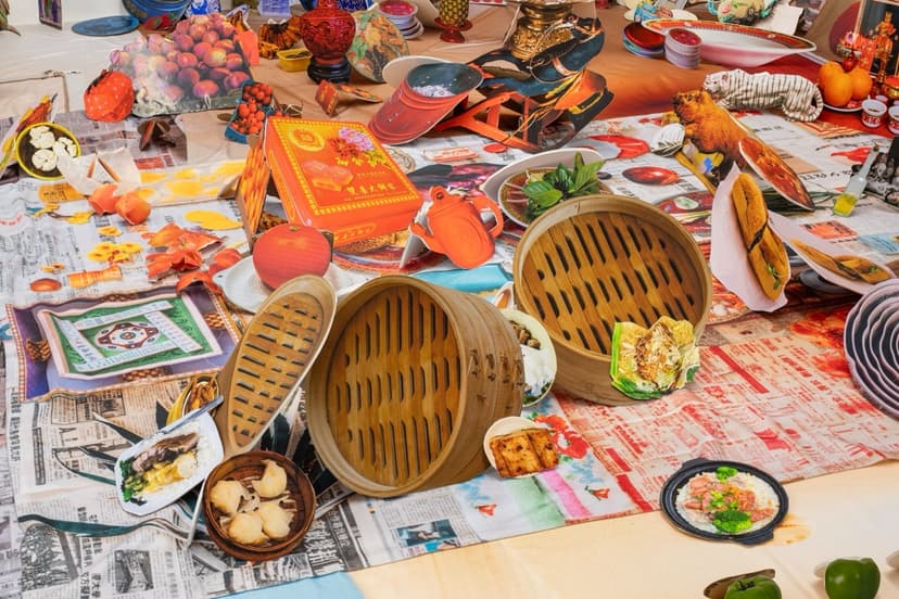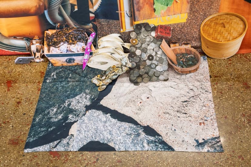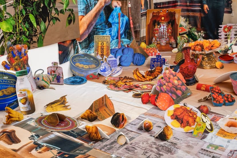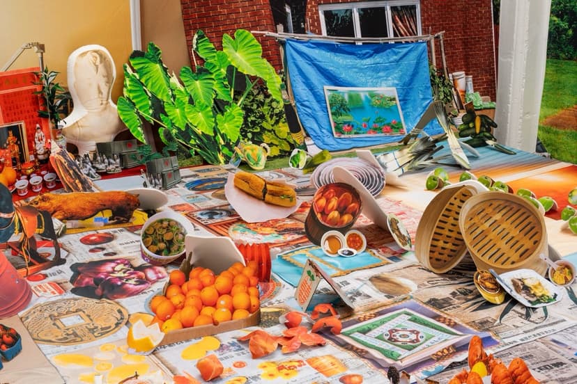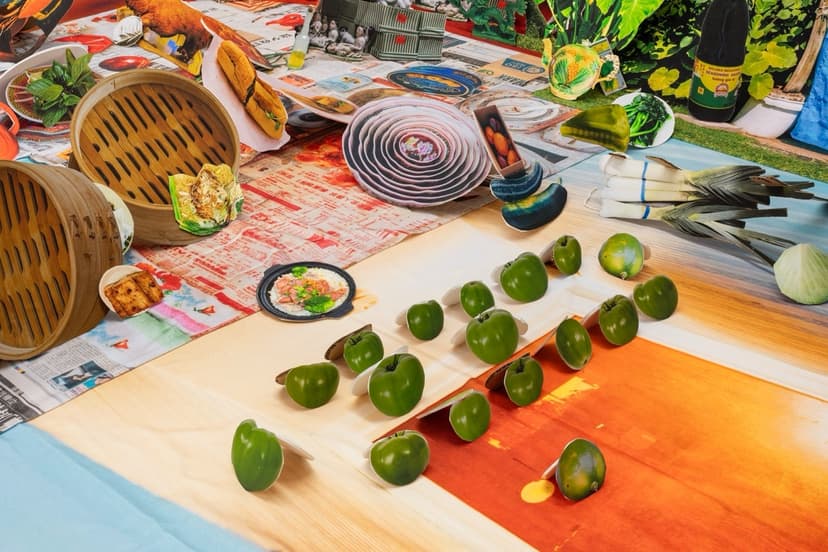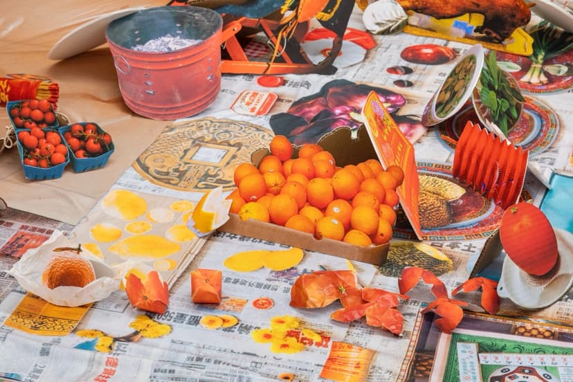 “Tommy Kha: Leftovers” presents a multi-layered installation composed of fragmented photographs depicting food, fruit, household objects, family, and staged interior scenes. The images are printed on materials including paper, aluminum, and fabric, and draw from art historical references, personal memory, and cultural practices of reuse and offering. The installation reflects on accumulation, care, and the circulation of images and objects.