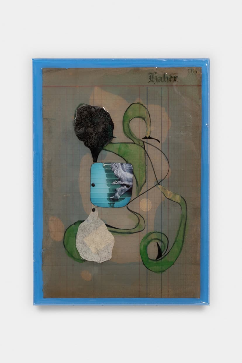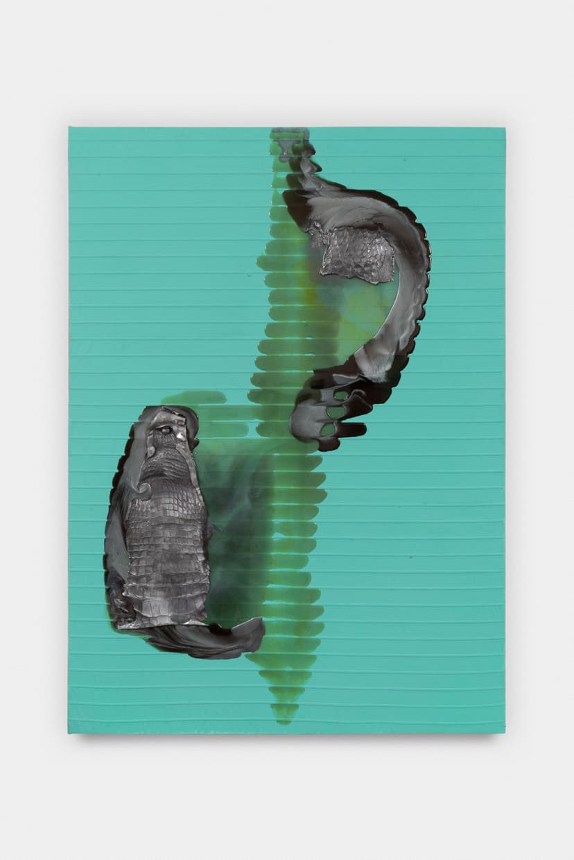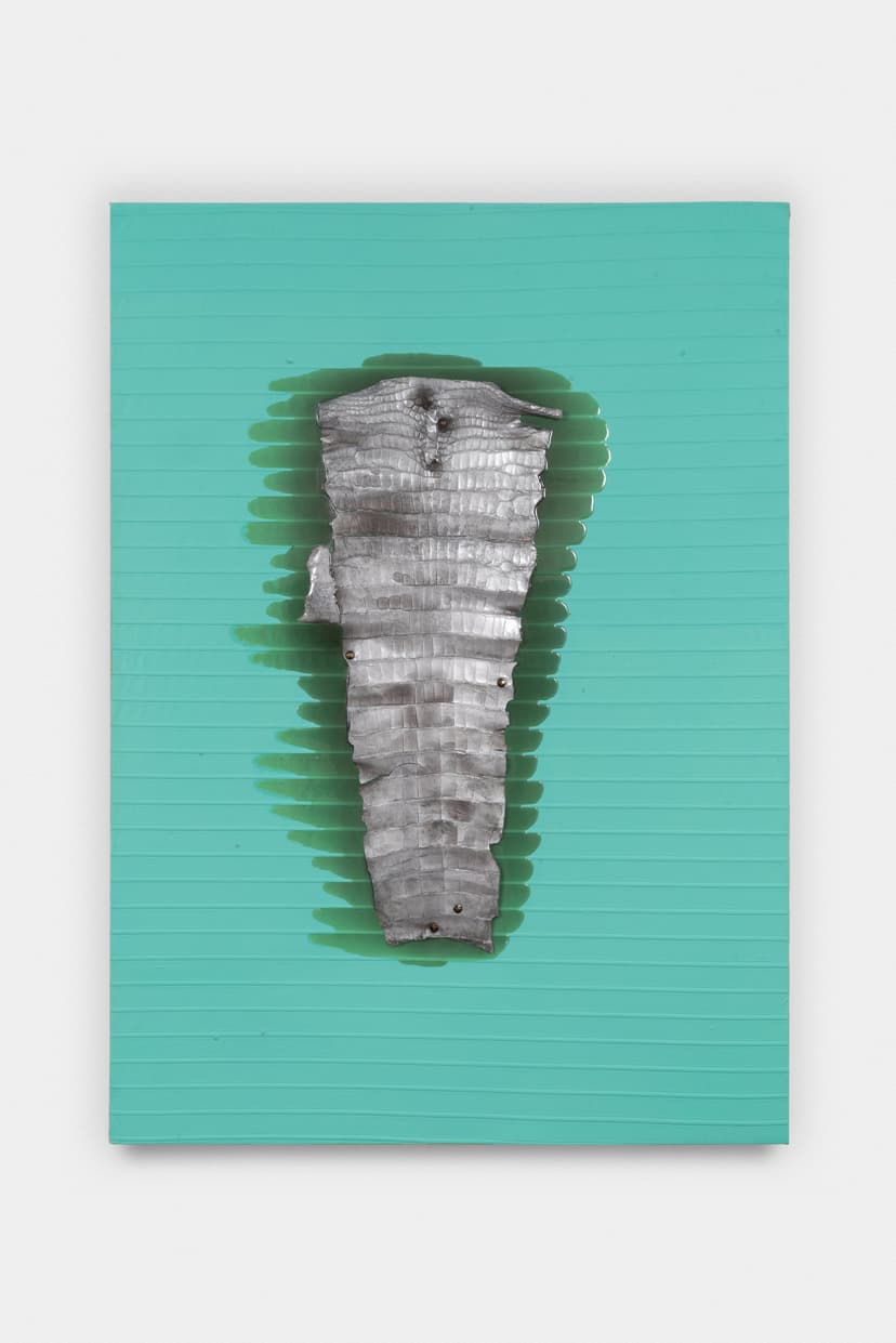 Sophronia Cook: Limbo at Spy Projects presents fragmented alligator forms suspended between life and death, invoking surfaces charged with memory and decay. Synthetic turquoise and organic figuration evoke bruised, half-remembered bodies. Snail shells cling to flattened skins, referencing consciousness tied to physical form. Works on aged ledger paper echo the alligator’s shape, suggesting memory as a shifting, unstable reconstruction rather than a fixed recollection.