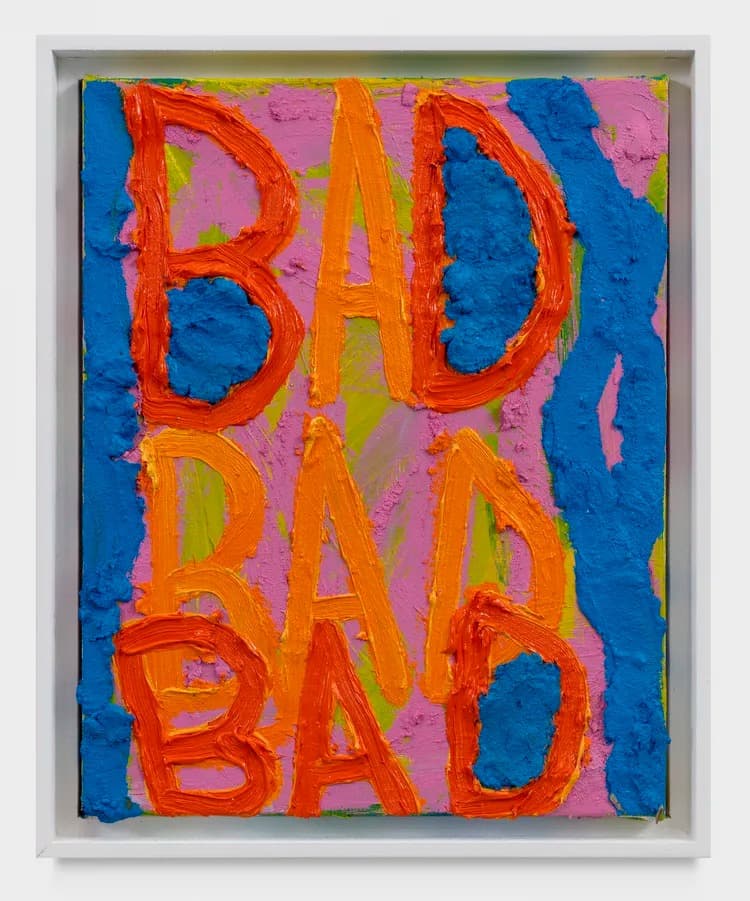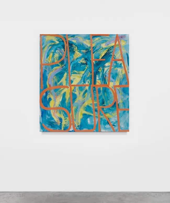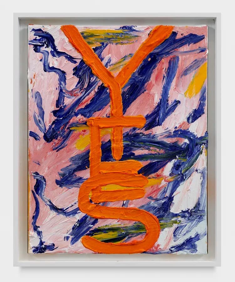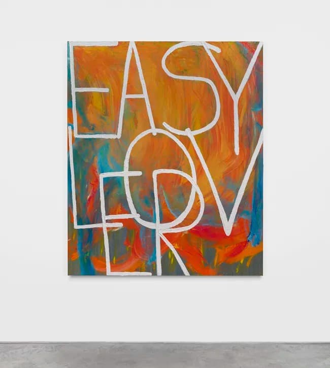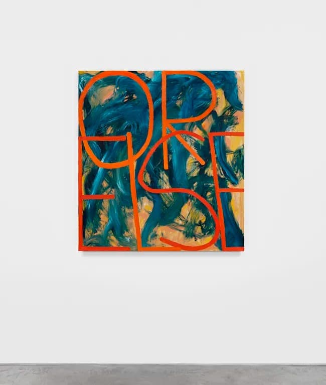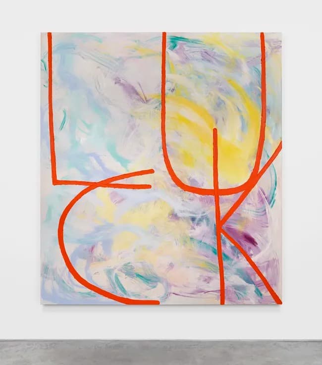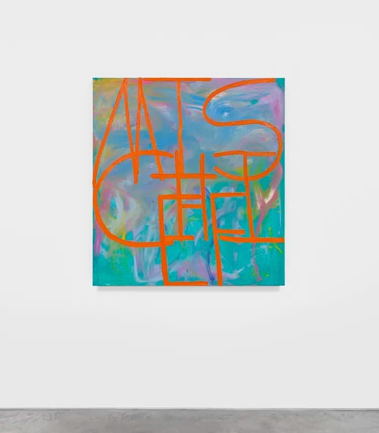 Luck or Else presents new paintings by Sam Jablon that disorient as much as they captivate. Jablon’s practice fuses text and paint into layered, heavily revised compositions where erasure is as present as mark-making, and the meaning of letters slides into abstraction. Color destabilizes language. Words structure the canvas like scaffolding. The result is deliberately unresolved, chaotic yet controlled, humorous yet searching, abstract yet insistently alive.