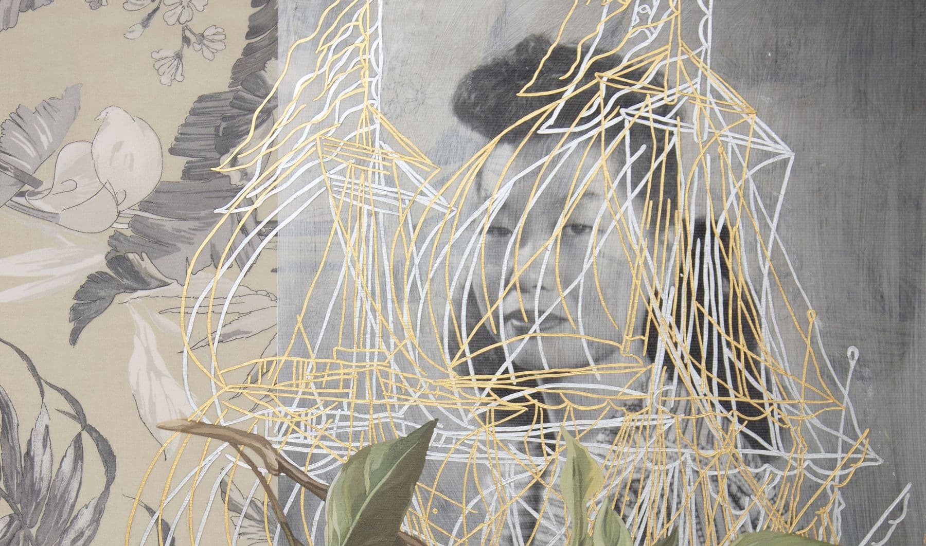 My Fantasy's Burdens is an exhibition of new works by Kyungmi Shin that explore cultural identity and colonialism through symbolic visual language. Shin transfers Korean American diasporic portraits onto found chinoiserie textiles—artifacts of Orientalist fantasy. She then overlays botanic forms once subjected to colonial taxonomies alongside icons drawn from Korean shamanistic cosmology: animals, talismanic symbols, deities, and hybrid beings. The result is a visual palimpsest where diaspora, desire, and colonial history are held in the same surface.