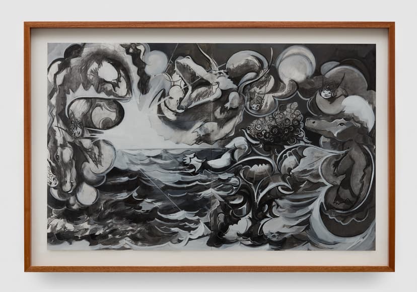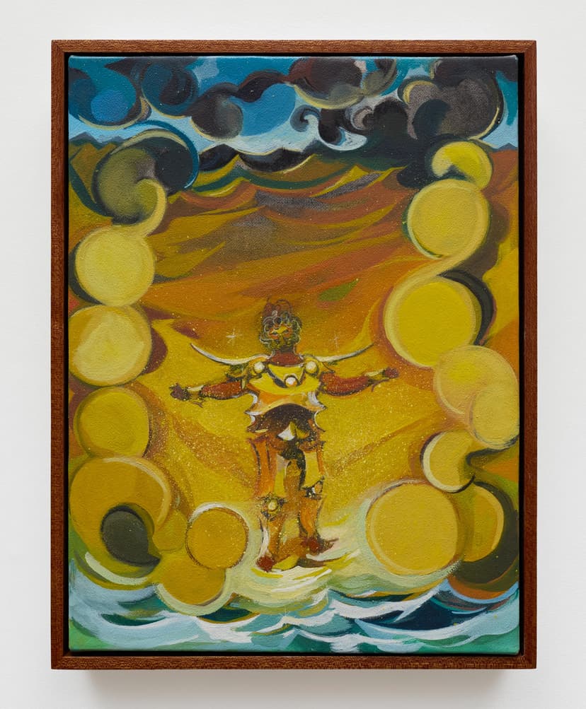 Asif Hoque’s new body of work centers on Golden Boy’s first encounter with a radiant celestial figure, translating a single transformative moment into a series of mythic paintings. Expanding his luminous world of cloudscapes and imagined beings, the cycle blends art historical references, personal narrative, and hybrid stylistic influences to depict an intimate yet cinematic vision of love and revelation.