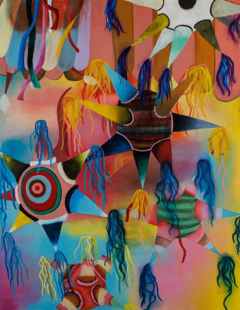 Notes from Lagunilla marks Monika Michalko’s New York debut, presenting paintings shaped by recent travels in Mexico. Her saturated, destabilized compositions merge landscape and still life into immersive worlds of shifting scale and skewed perspective. Inspired by markets such as La Lagunilla, works feature piñatas, textiles, and La Catrina, reimagined through prismatic color. Michalko constructs theatrical spaces where commerce, myth, and memory circulate at once.
