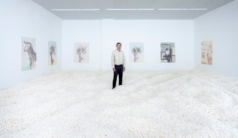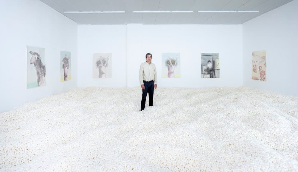 Joe Sola is a Los Angeles-based artist known for his conceptual and often humorous approach to painting, video, and performance. His work challenges the conventions of the art world, frequently incorporating satire, physicality, and unexpected juxtapositions. He has many art works that continue to be exhibited around the world including: Studio Visit (2005) in which he jumped out his studio window crashing through breakaway glass, Portraits: An exhibition in the ear of TIF SIGFRIDS (2013), in which he built a small gallery that fit in his gallerist’s ear, and six microscopic oil paintings which he hung in the gallery, and The Painted Horse by Joe Sola (2015), in which converted the gallery to a collector’s dining room filled with contemporary abstract paintings. For Sola’s contribution he painted a geometric painting directly on a miniature horse which roamed freely in the dining room during gallery hours.