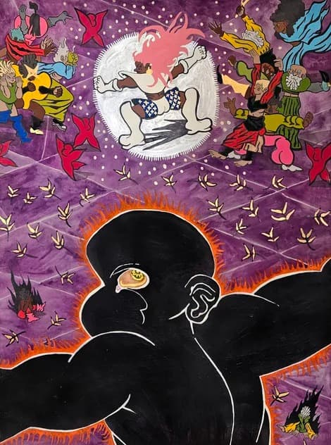Paracosmos is a solo exhibition by Los Angeles based artist Cash Cooper at KP Projects. The exhibition presents energetic works featuring mythical figures, human protagonists, and demonic characters. Drawing on an imagined world, the works unfold through animated compositions and narrative scenes.