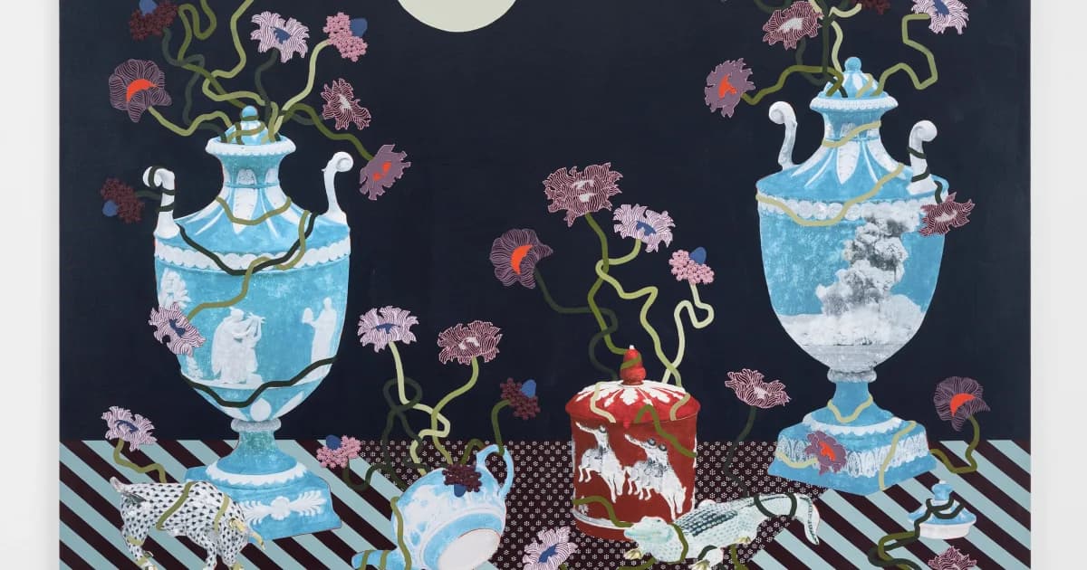 Paraphernalia at HESSE FLATOW features Lizzie Gill’s paintings exploring material culture, memory, and inheritance through porcelain objects. Gill recontextualizes her mother’s ceramics, using image transfer techniques to create narratives from personal and cultural symbols. Her works depict vessels with human-like features, blending domestic interiors with expansive landscapes. The exhibition reflects on stewardship, care, and the history of objects, tying the title to the concept of a woman’s property outside marriage.