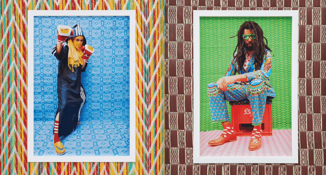 Hassan Hajjaj’s People of My Time exhibition features vibrant photographic portraits of global figures, including artists, musicians, and designers, taken between 2000 and 2022. Accompanied by repurposed plastic floor mat frames, the portraits celebrate global connections and cultural fluidity. In addition to the portraits, Hajjaj recreates his Marrakesh tearoom, Jajjah, offering a sensory experience with seven teas representing the saints of Marrakesh, and featuring Moroccan artists on its packaging.