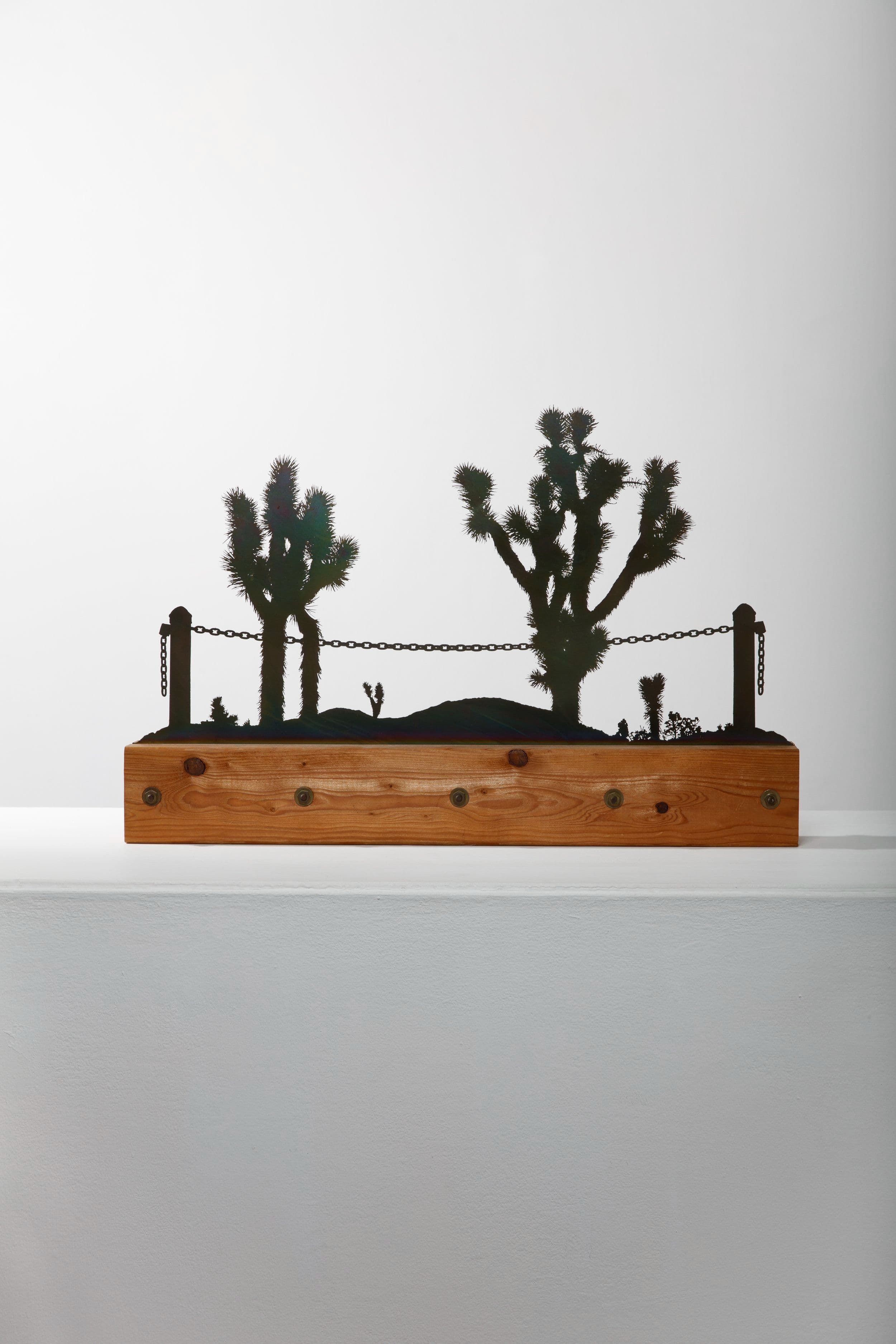 The current exhibition at Craig Krull Gallery assembles McMillan’s key explorations into photosculpture, including his work with photo-etched metals. Questioning whether the materiality of a photograph was limited to paper, McMillan used acid to etch the silhouette of his photographic images into thin copper and steel sheets. Some metal cut-outs stand up straight with wooden supports; others are incorporated in rolls of metal that appear to unwind off the wall; and others still line the top edges of metal lunch bags. In fact, the paper bag motif is a consistent shape and symbol in McMillan’s work, paralleling Pop Art’s fascination with the everyday object. McMillan regularly created photosculptures by folding his photographs into the forms of paper bags, or by mounting photographs inside actual paper bags, tearing holes in the sides to expose the interior images—they literally forced new ways of looking at photographs.