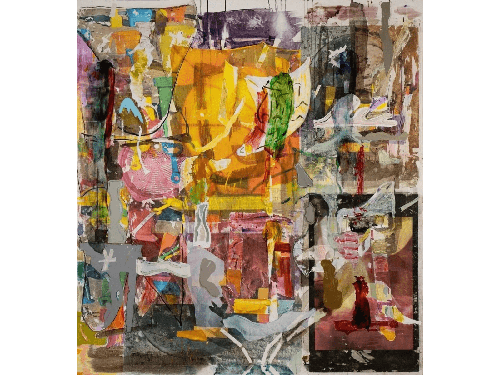 Thomas Berding: Projections in the Deluge builds paintings from cultural and personal ephemera — junk mail, web search screenshots, iPhone snapshots, Midwestern vernacular imagery — layered with collaged paint skins and palette remnants. The resulting works carry visible traces of their own making, dense with references organized by an idiosyncratic logic that resists fixed interpretation. Responding to contemporary information overload, Berding positions painting as a space where memory, loss, and recovery converge to construct imagined futures from the material of the past.