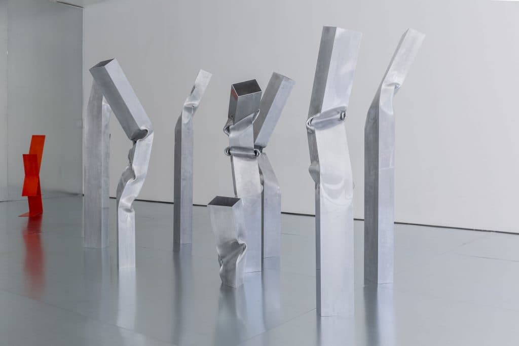 In PROOON, Jakobsen sets forth a visual landscape that blurs the line between sculpture and installation. A series of eight bent aluminum columns share an intimate space with colored geometric metal cutouts, establishing a visual lexicon centered on the notions of form and subject, repetition and symmetry, and materiality and transformation. The works are displayed on large sheets of galvanized zinc creating a space-distorting effect suggestive of the built environment. Jakobsen fuels her contextual platform through Escher’s logic of space and proto-minimalist installations, such as El Lissitzky’s utopian Proun Room, 1923. In this recent body of work, Jakobsen seeks to destabilize what is historically named as a Minimalist visual language, opening it up to new interpretations.