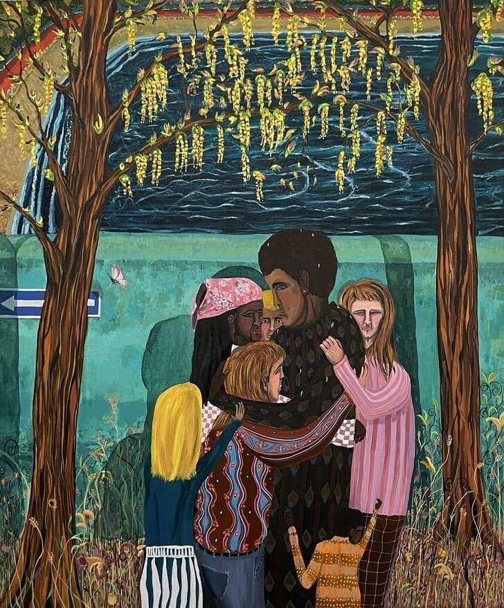 Zachary Wollard’s “Remote Viewing” presents paintings and sculptures generated through “projective imagination,” using layered acrylics to allow figurative forms to emerge spontaneously. His works depict elongated, patterned figures in ambiguous social moments—nightclubs, ceremonies, and intimate embraces—capturing camaraderie, isolation, and melancholy. Narratives unfold organically, emphasizing relational tension while leaving interpretation open and uncertain.