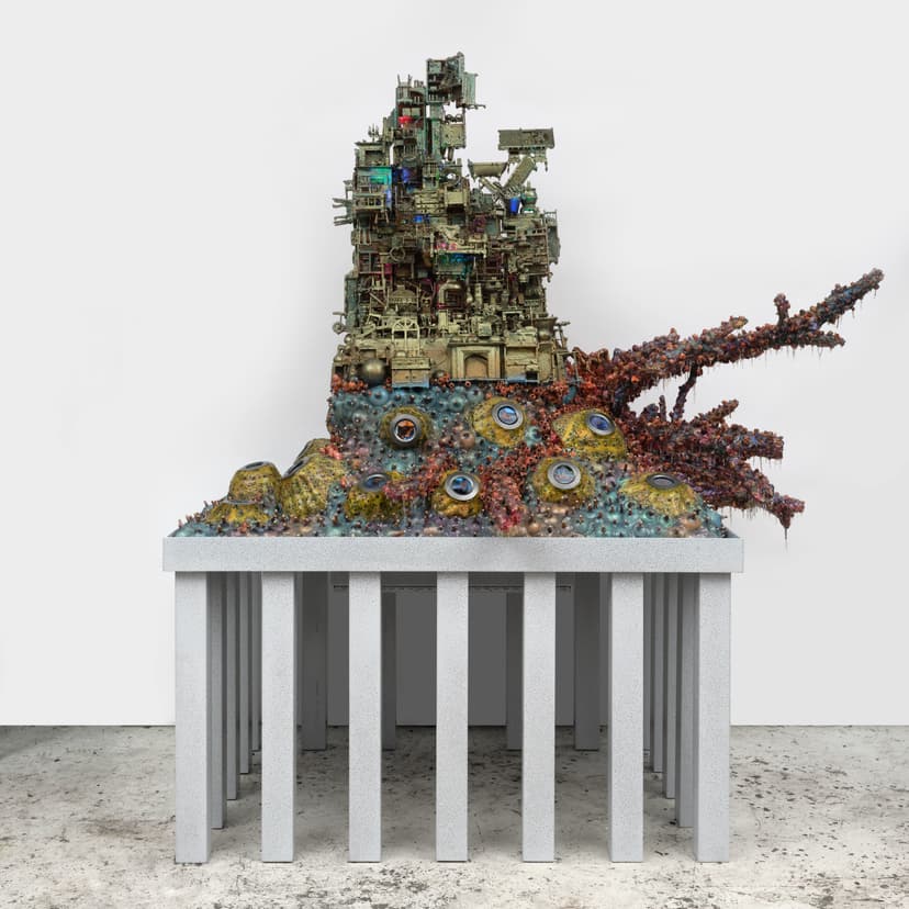 Scavenger, Max Hooper Schneider’s first New York solo exhibition at 125 Newbury, immerses viewers in speculative ecosystems where science and art collide. His chaotic dioramas of coral, copper, oil-soaked toys, and glowing pill capsules evoke post-human landscapes questioning the divide between nature and culture. Both absurd and melancholic, the works probe decay, mutation, and resilience in a world shaped by collapse and transformation.