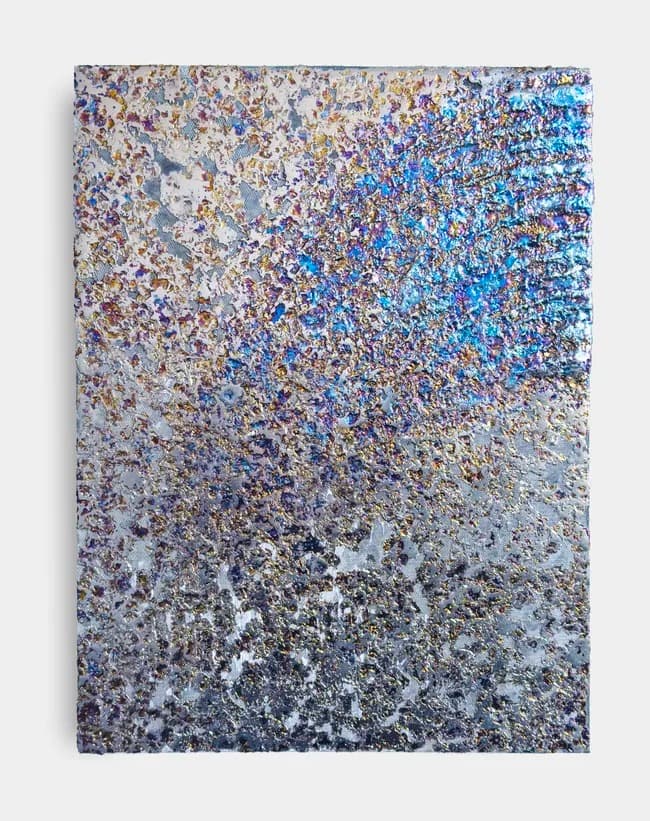 Seffa Klein's multidisciplinary practice spans elemental metal paintings, sculpture, installation, writing, and music, drawing on meditation, mathematics, and visionary experience to communicate across scales from the molecular to the astronomical. Her Fire Blankets series — bismuth on woven glass — pursues what she calls Hierophany: the physical embodiment of the divine. Sculptural works including the SK Brick and AD Plank interrogate the basic units through which reality is constructed, proposing playful subversions of accepted modes of building and meaning-making.