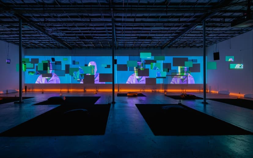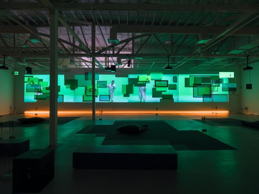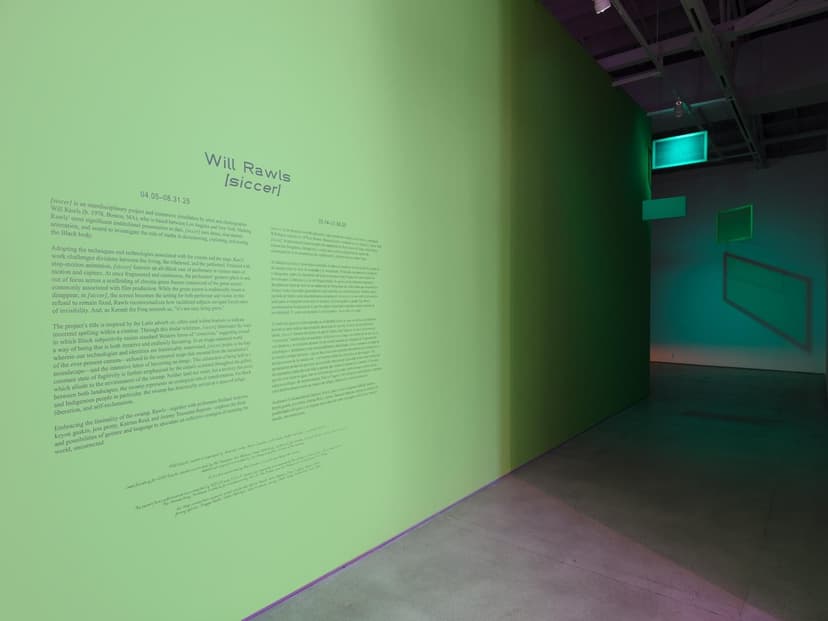 [siccer] is an interdisciplinary project by Will Rawls combining dance, animation, sound, and photography. Through stop-motion video and immersive installation, Rawls explores how media constructs and distorts the Black body. Projected on suspended green screens, fragmented movements challenge fixed identity and capture. Inspired by “[sic],” the work questions correction, embraces transformation, and resists imposed narratives.