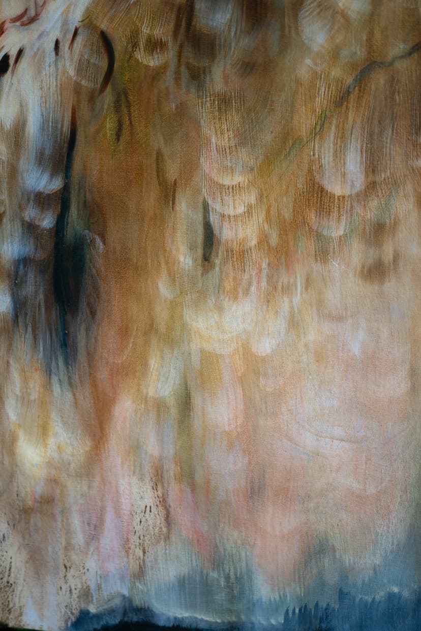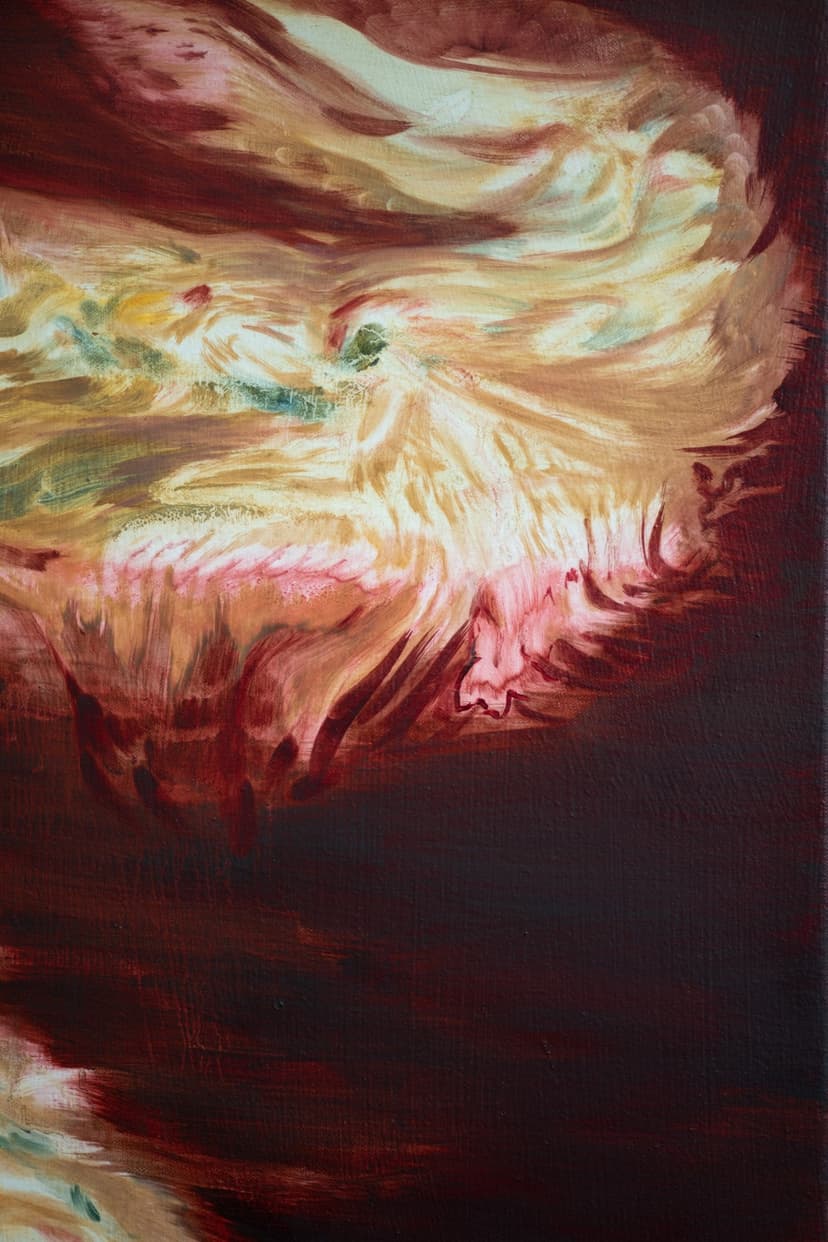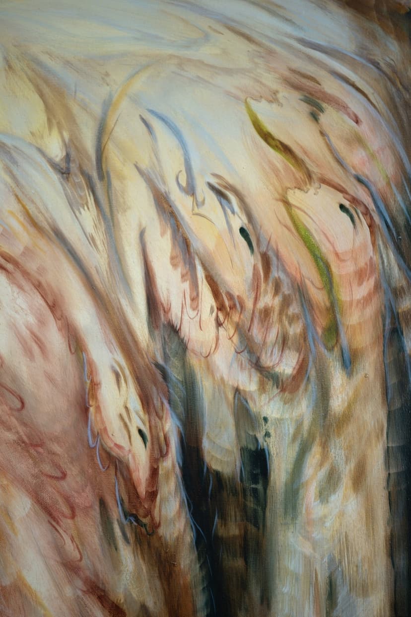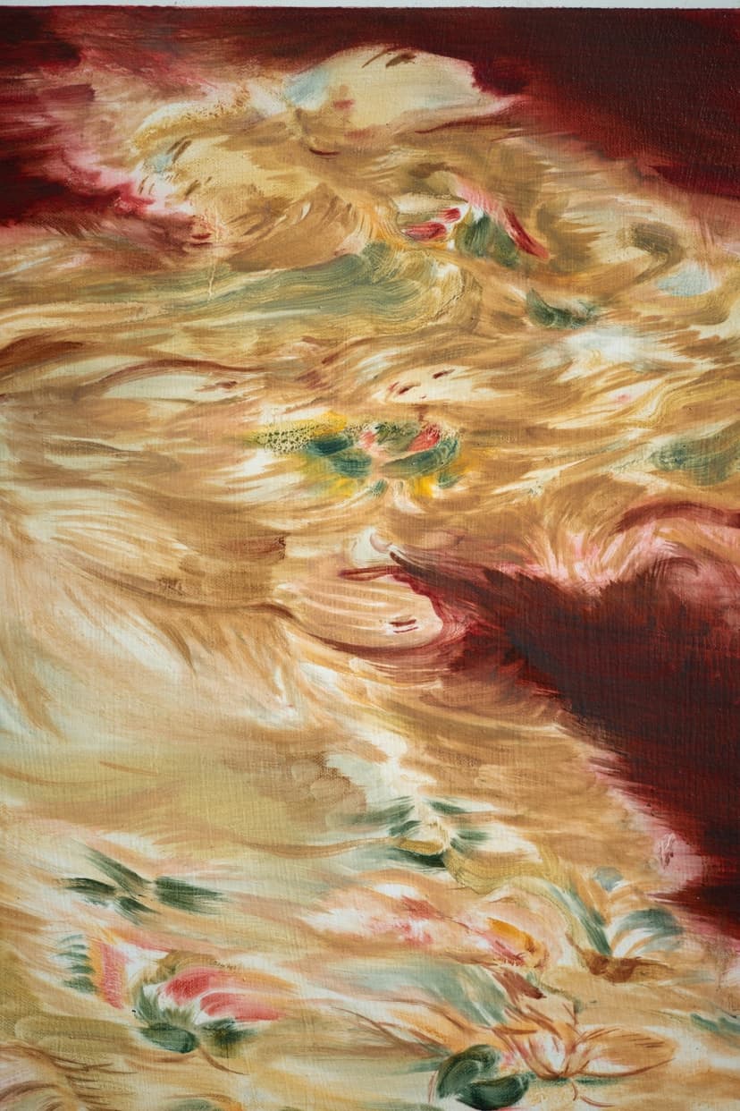 In Stay Longer, Chantal Khoury presents paintings centered on domestic table scenes—dining rooms, coffee tables, and gatherings that evoke fleeting memories. Repeated motifs like cups, dishes, and peacocks serve as visual echoes of inherited experience. Her fluid, gestural technique emphasizes movement and impermanence, exploring how memories and identity shift through time. Each work becomes a vessel holding moments that resist permanence yet continue to inform the present.