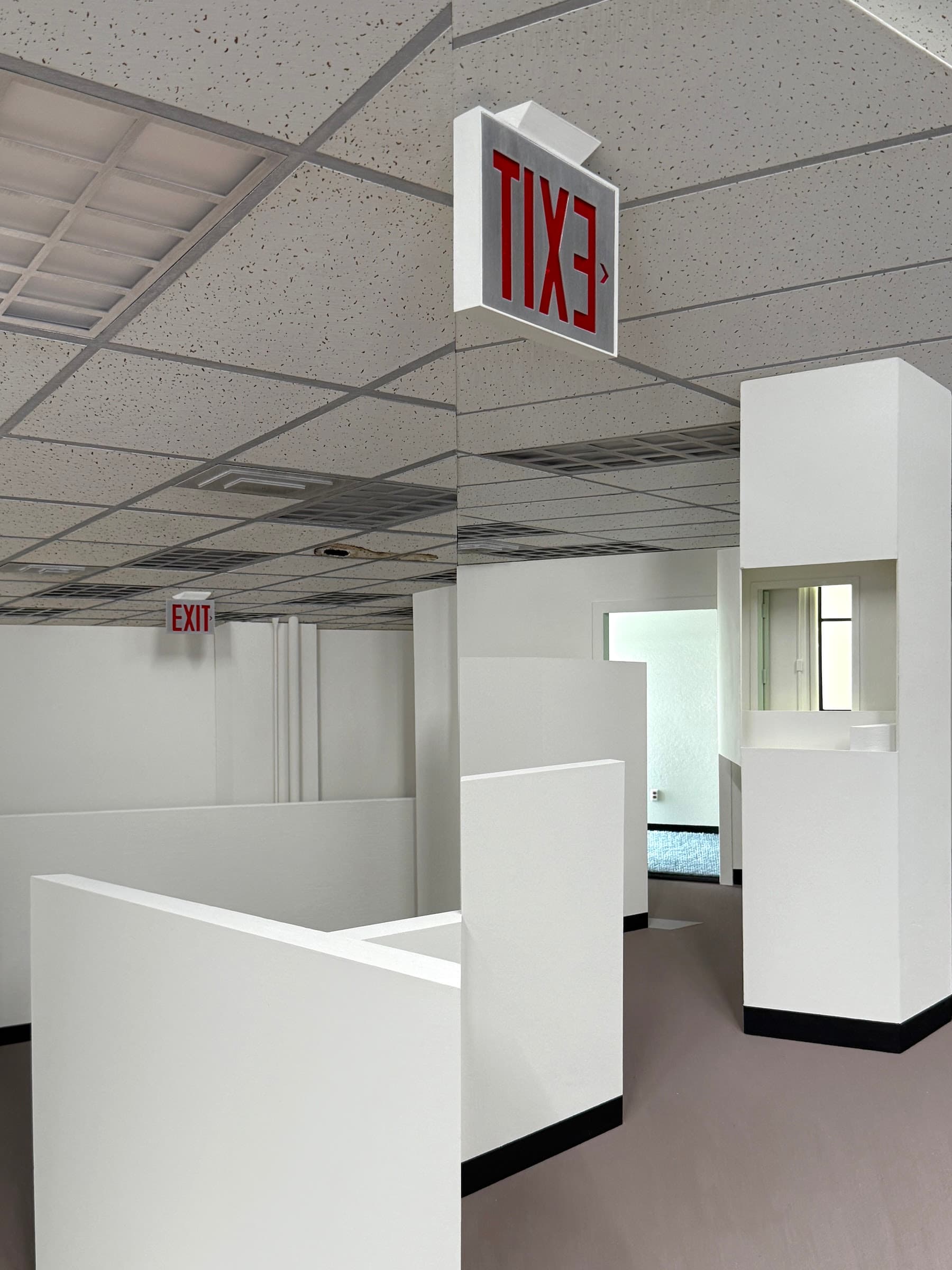 Meredith James: The Exit explores an abandoned office through dioramas and photographs, revealing decay, nostalgia, and disorientation. Mirrors and reflections distort space, transforming cubicles, ceilings, and fixtures into theatrical, dreamlike structures. Her work examines perception, illusion, and the remnants of human presence, turning familiar office architecture into a fragmented, uncanny meditation on absence and the environments we inhabit.